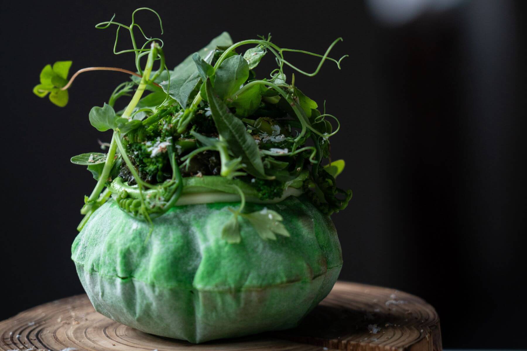 為了豐富可食花草⽣活應⽤,凌宗湧更與曾於法國頂尖廚藝學校Paul Bocuse習藝的「Island133」主廚Leo,研發三道可食花草限定菜⾊:「啟航」透過解構日式料理軍艦捲,將台灣的當季水果、白米脆餅、海苔、海膽與金蓮花結合;「寶島長春」以台南美術館中收藏的巨幅水墨畫《寶島長春圖卷》為靈感,使用爐烤、川燙、醋漬、炙燒、油封等料理手法處理在地食材;「我喫了一座森林」打造餐桌上的城市綠洲,把過貓、山葵、馬告等在地特殊香草,包入特製的圓形苔癬脆餅中,打造充滿森林感的料理。