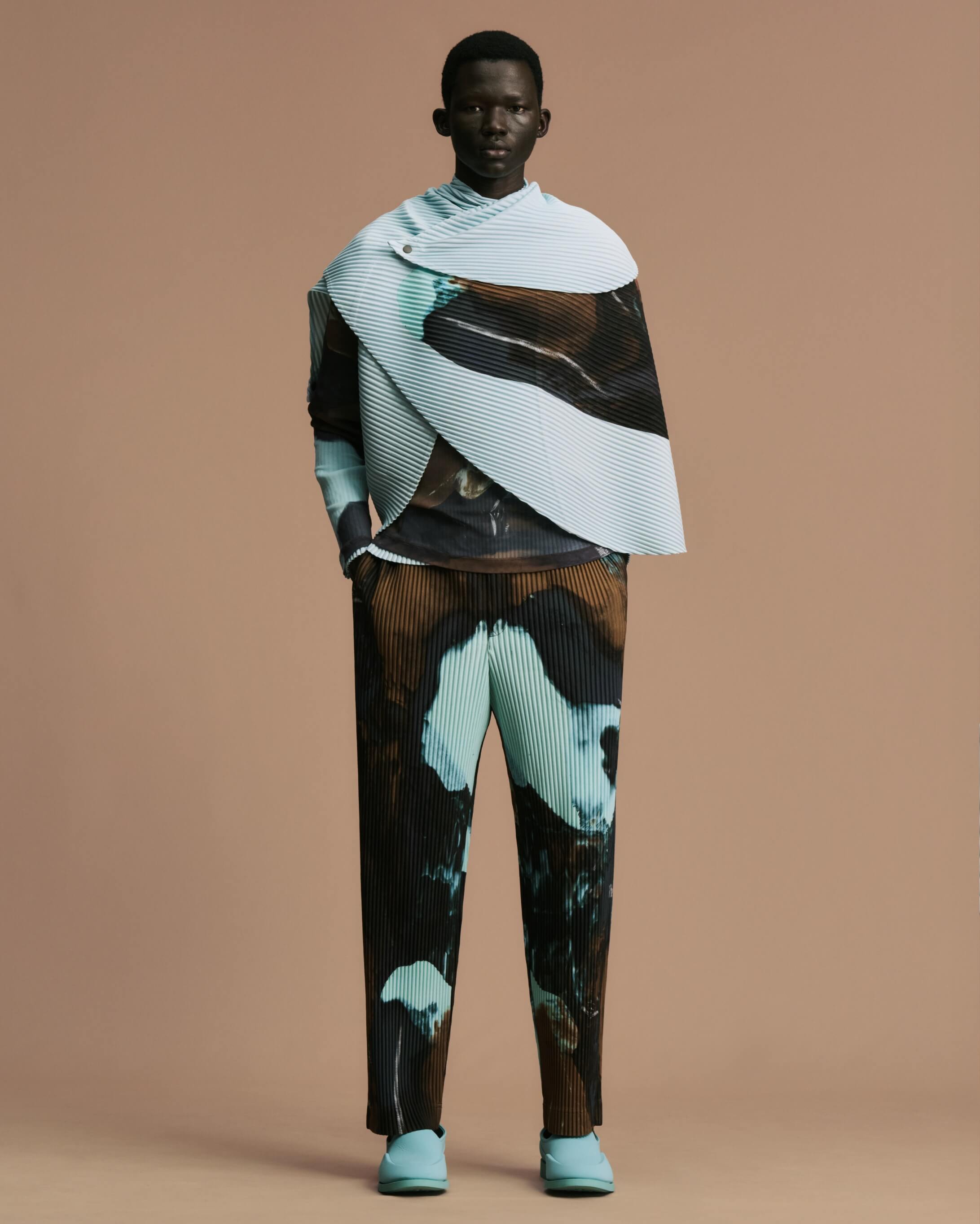 HOMME PLISSÉ ISSEY MIYAKE作為三宅一生旗下男性服裝品牌,不僅繼承了以身體為衣服提供型態的特質,將舒適度與時尚性完美結合,更是重新定義當代男性的日常穿著,實現經典男裝與時俱進的生命力。2025秋冬系列是一場來自自然礦物的靈感旅程,設計團隊從大自然中拾取形態各異的礦物,觀察其中蘊藏的色澤、紋理與質感。將礦物的深沉與閃耀,新生岩石的斑駁與活力化作設計語彙,流轉於布料之間。透過不同的彩繪技法轉譯礦物的色澤與紋理,將其結構特徵融入版型設計,使服裝在柔軟與堅毅之間取得平衡,彷彿是一段時光之旅。