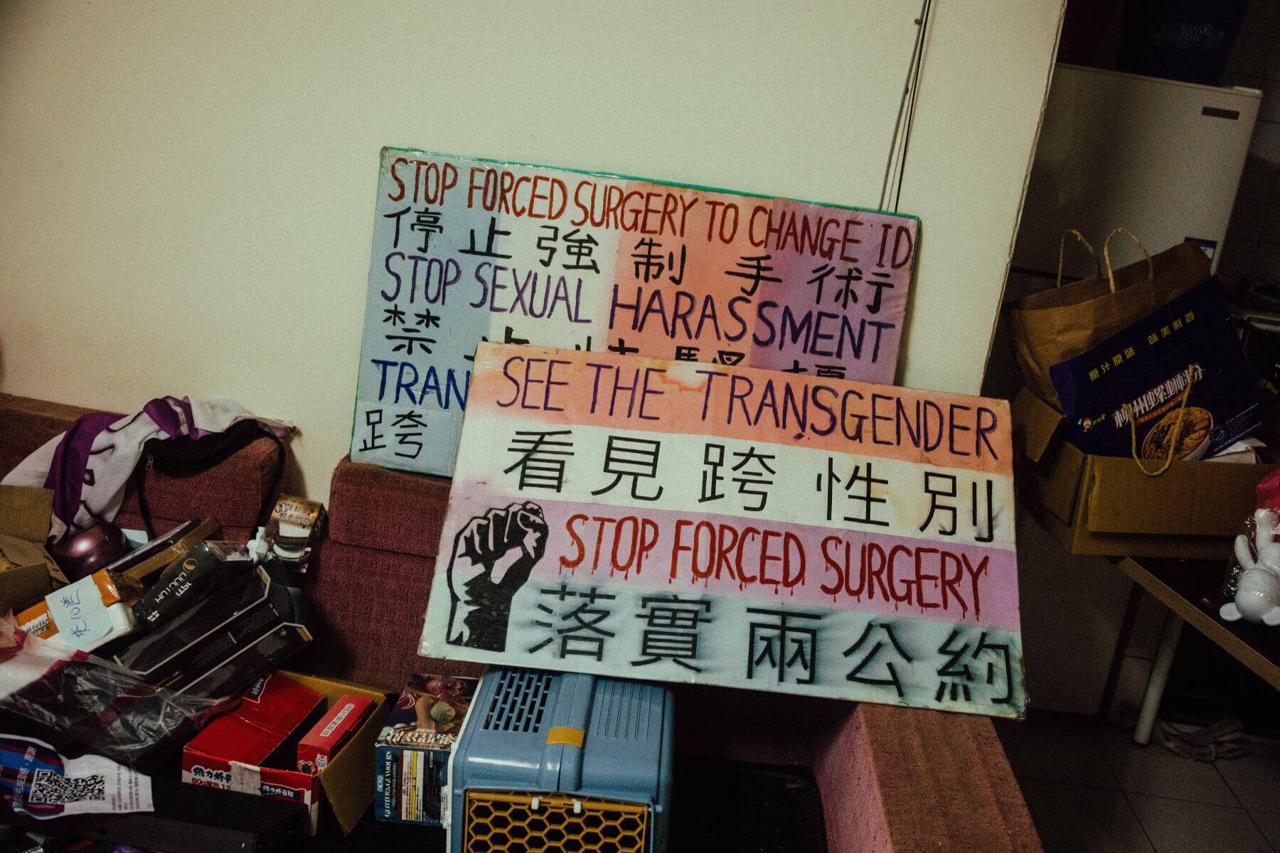 走進吳伊婷老公寓二樓的家,堆滿雜誌的客廳沙發上,擺放著寫有「看見跨性別、禁止性騷擾」等標語的看板,是「性別不明關懷協會」在2013年參加同志遊行時製作的道具。