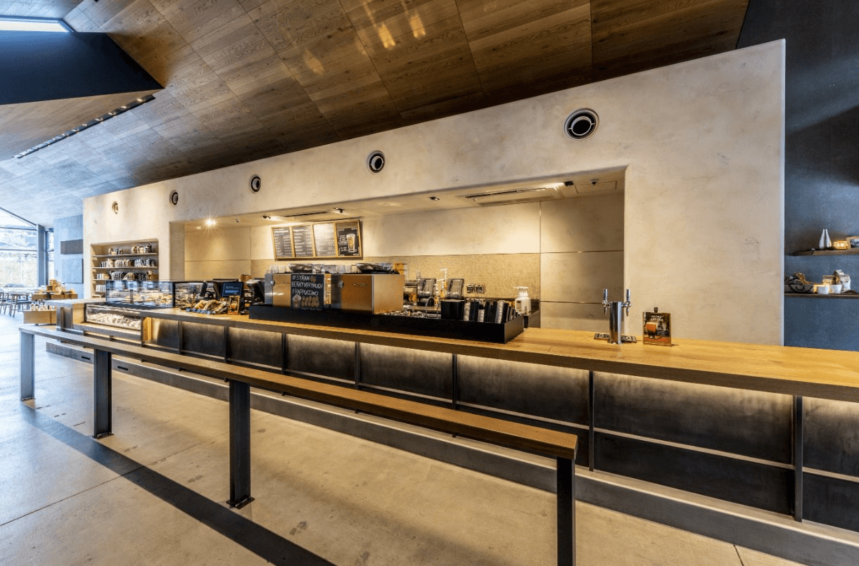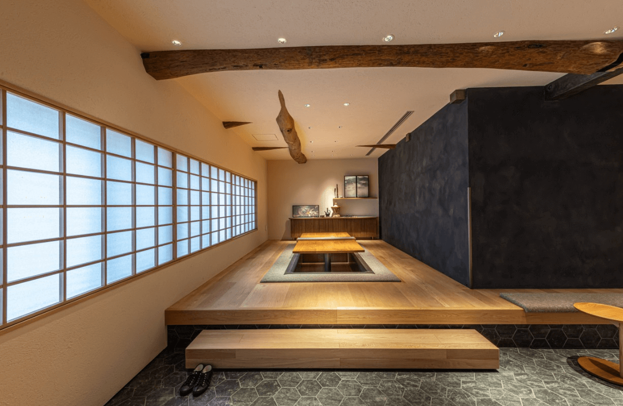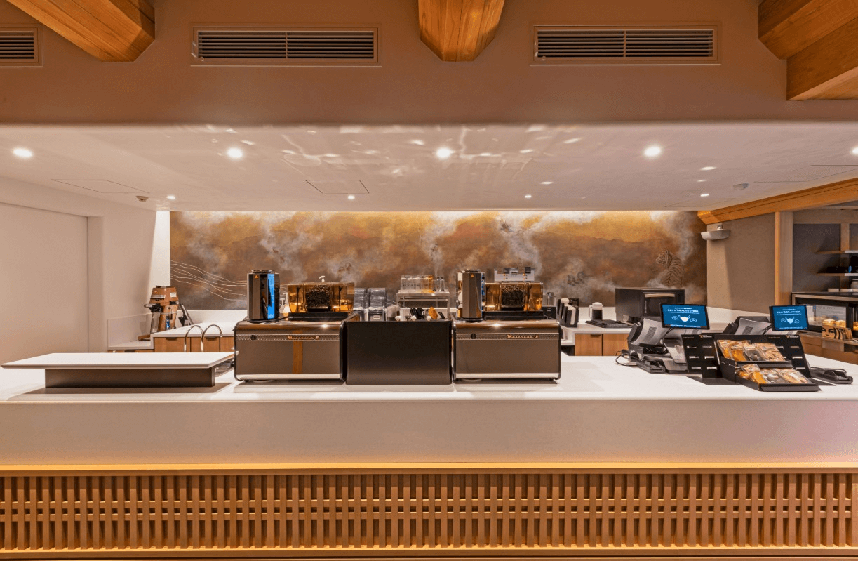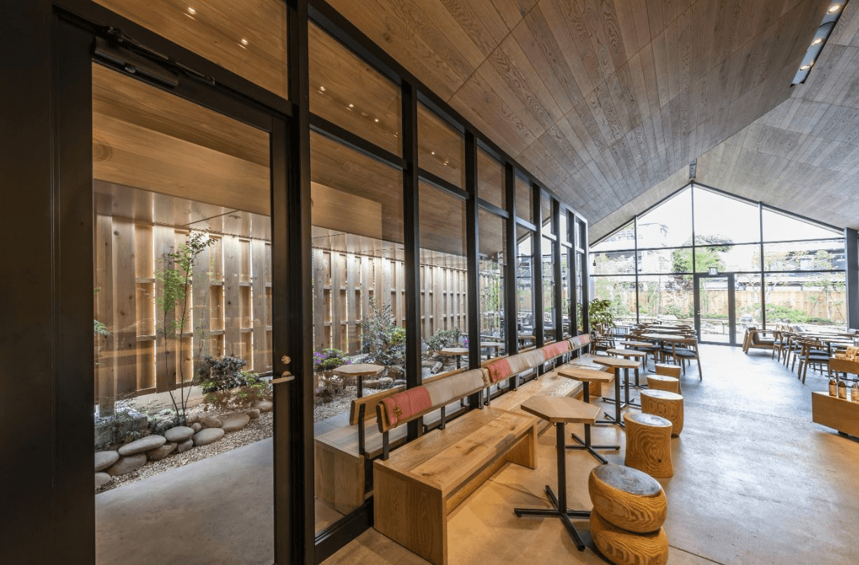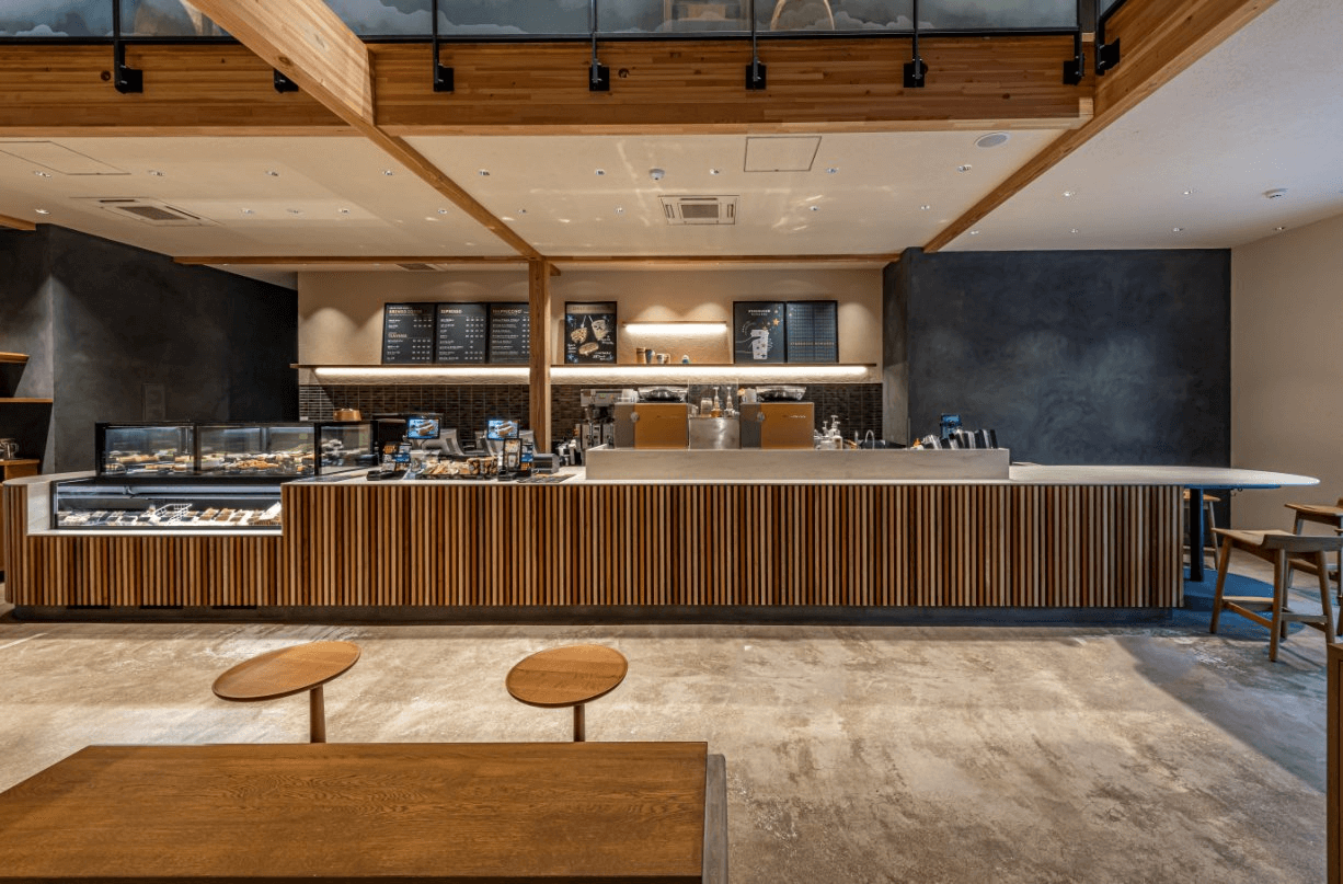 「川越鐘つき通り店」正是借鑑此風格,重現川越傳統建築意象,與街景自然融合,選用在地杉木建構外觀,LOGO也由招牌的綠轉為內斂的黑,與四周環境和諧呼應。走進店內,灰黑色調延續著藏造風格,並設有一處靜謐小庭,吧檯與座位之間點綴著江戶時代傳承而來的「川越唐桟」織布長椅,溫柔地迎接每一位來訪的客人。