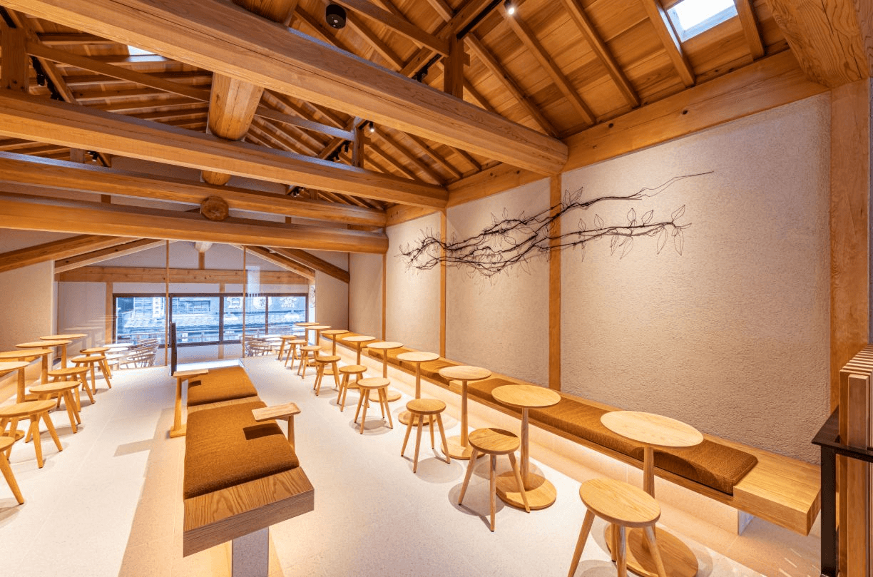 「京都二寧坂ヤサカ茶屋店」是一間正統町家改建的門市,坐落於擁有百年歷史的老屋之中,相較於其他醒目門店,這裡刻意低調,保留了建築本身的原貌與氣韻。町家建築一大特色,是從玄關前的小庭一路延伸至後院的「通庭」土間通道,店鋪忠實還原其幽暗氛圍與由中庭引入自然光的傳統設計,展現古宅特有的光影之美。