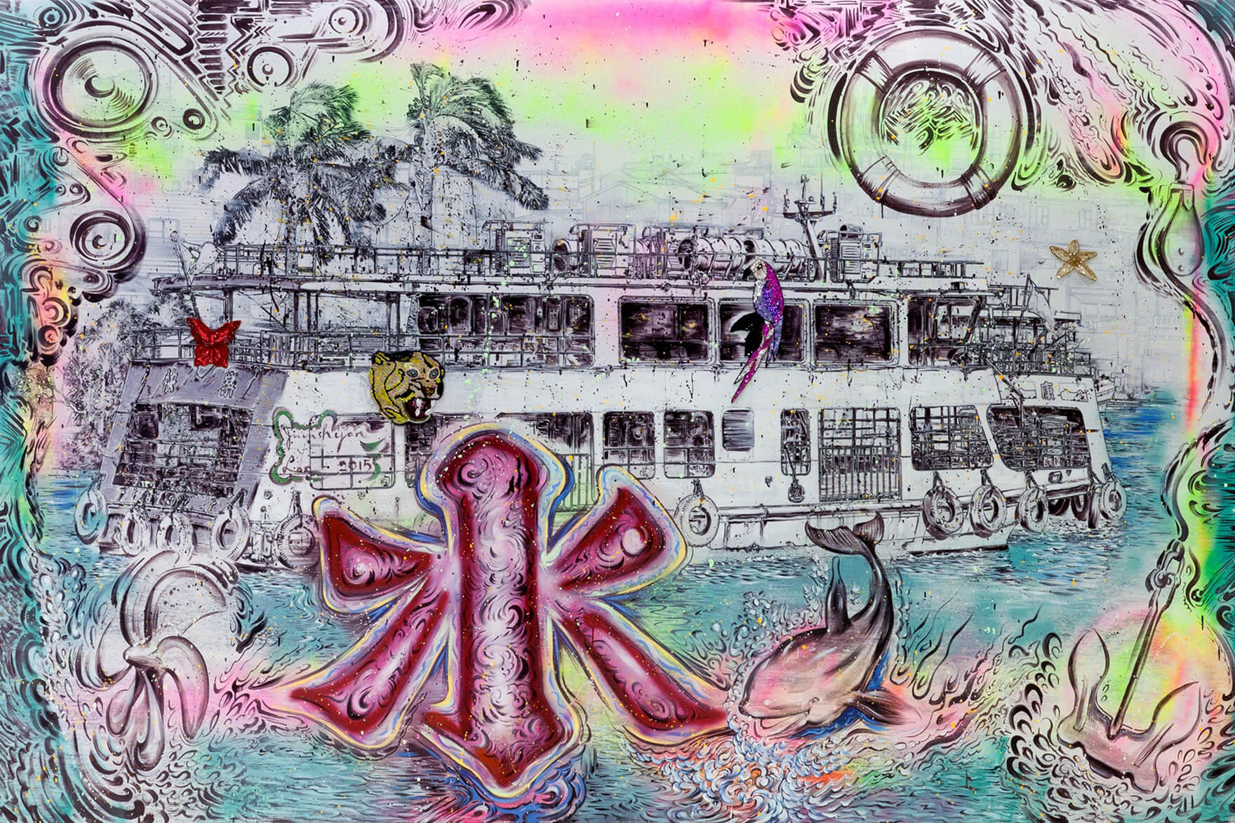 李俊賢,〈哈瑪星渡輪〉,2015,電腦影像輸出於畫布、油畫顏料、亮片圖案,224×344cm。(圖/藝術家家屬、高雄市立美術館提供)