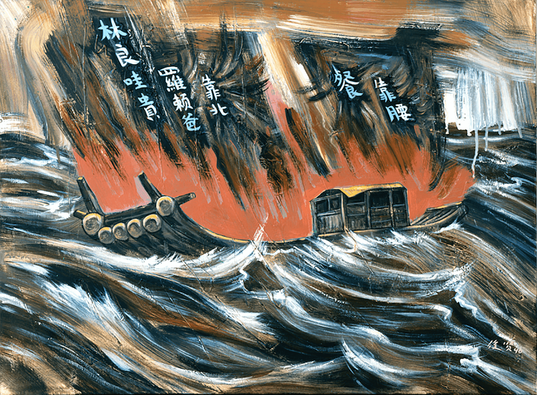 李俊賢,〈幹林周罵〉,1995,複合媒材,127×207cm。(圖/藝術家家屬、高雄市立美術館提供)