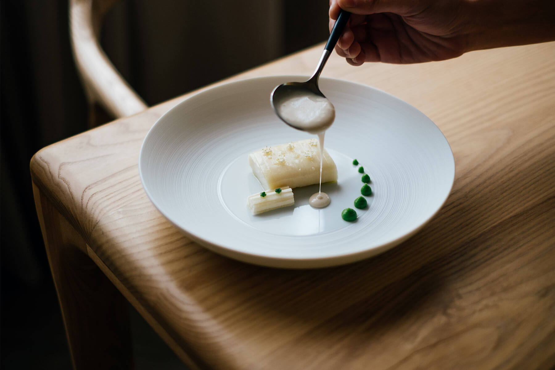 最新一季即是一道「沒有雞」的海南雞飯,細嫩圓鱈裹上一層刨成薄片的竹筍,偽裝成鮮滑白雞;米飯則與魚骨熬成濃郁米漿,化為醬汁,一旁點綴青龍椒製成的茉綠辣醬,顛覆這道菜的尋常模樣。