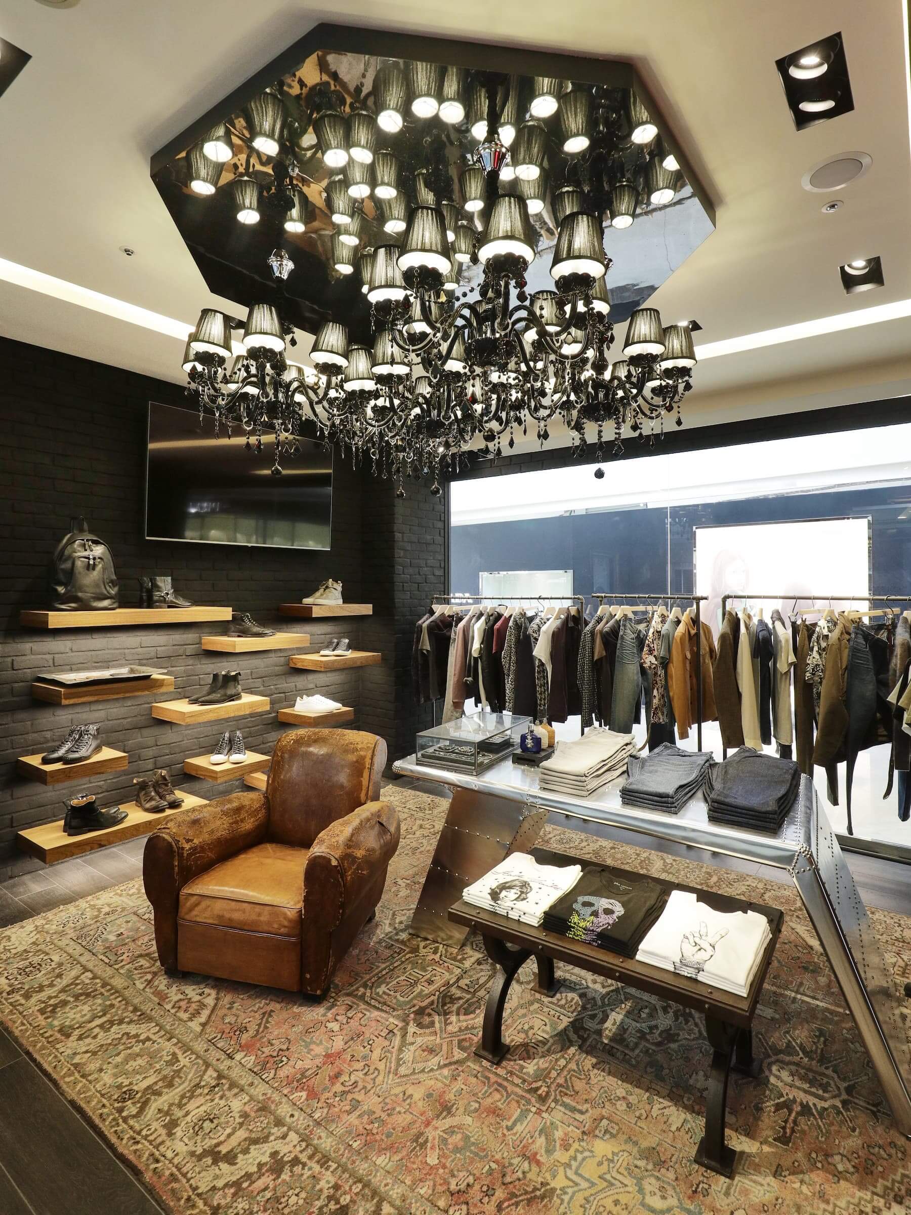 台灣首間精品店沿用品牌最具代表性的店面John Varvatos Bowery NYC 標誌性的設計美學,裝潢以深色系為主調,選用黑色磚牆搭配木質地板,與店內的水晶吊燈及紅色天鵝絨簾布形成鮮明對比,打造低調奢華且富有層次的視覺效果。此外,設計空間大量注入設計師鍾愛的、充滿個性的搖滾樂靈魂,包含代表性的霓虹燈裝置及音響設備,並以設計師 John Varvatos 成長的搖滾樂傳奇年代歌曲作為空間背景音樂,彰顯出品牌貫徹始終的搖滾叛逆精髓。