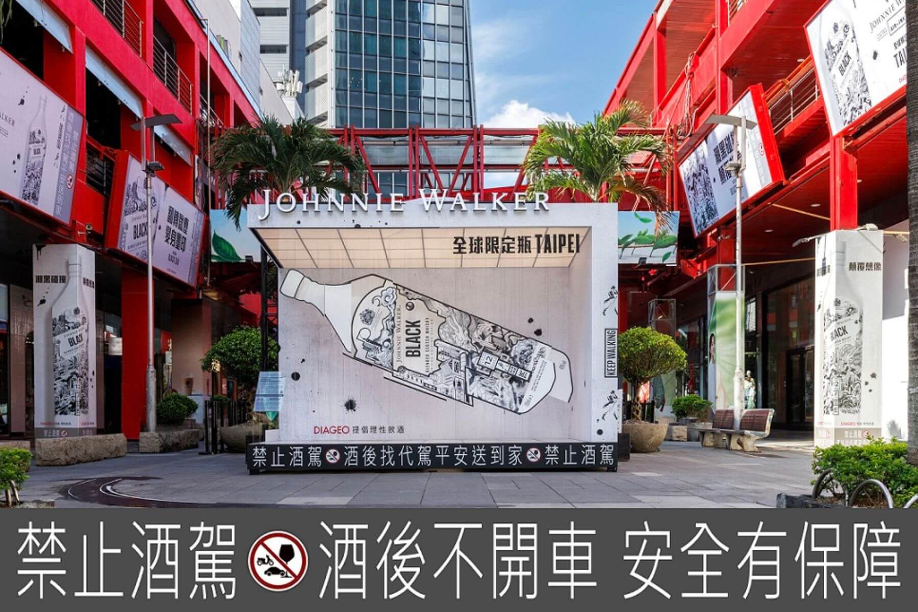 台北信義商圈即將掀起潮黑風暴,全球唯一的「Johnnie Walker AIR-INK™ 全球限定台北瓶錯視裝置藝術」坐落於信義威秀徒步區。裝置藝術靈感源自台灣知名塗鴉藝術家BlackZao創作的AIR-INK™ 全球限定台北瓶,融入龍騰、松竹梅等東方元素,加上台北101和台北捷運等地標建築,展現台北城市之美。