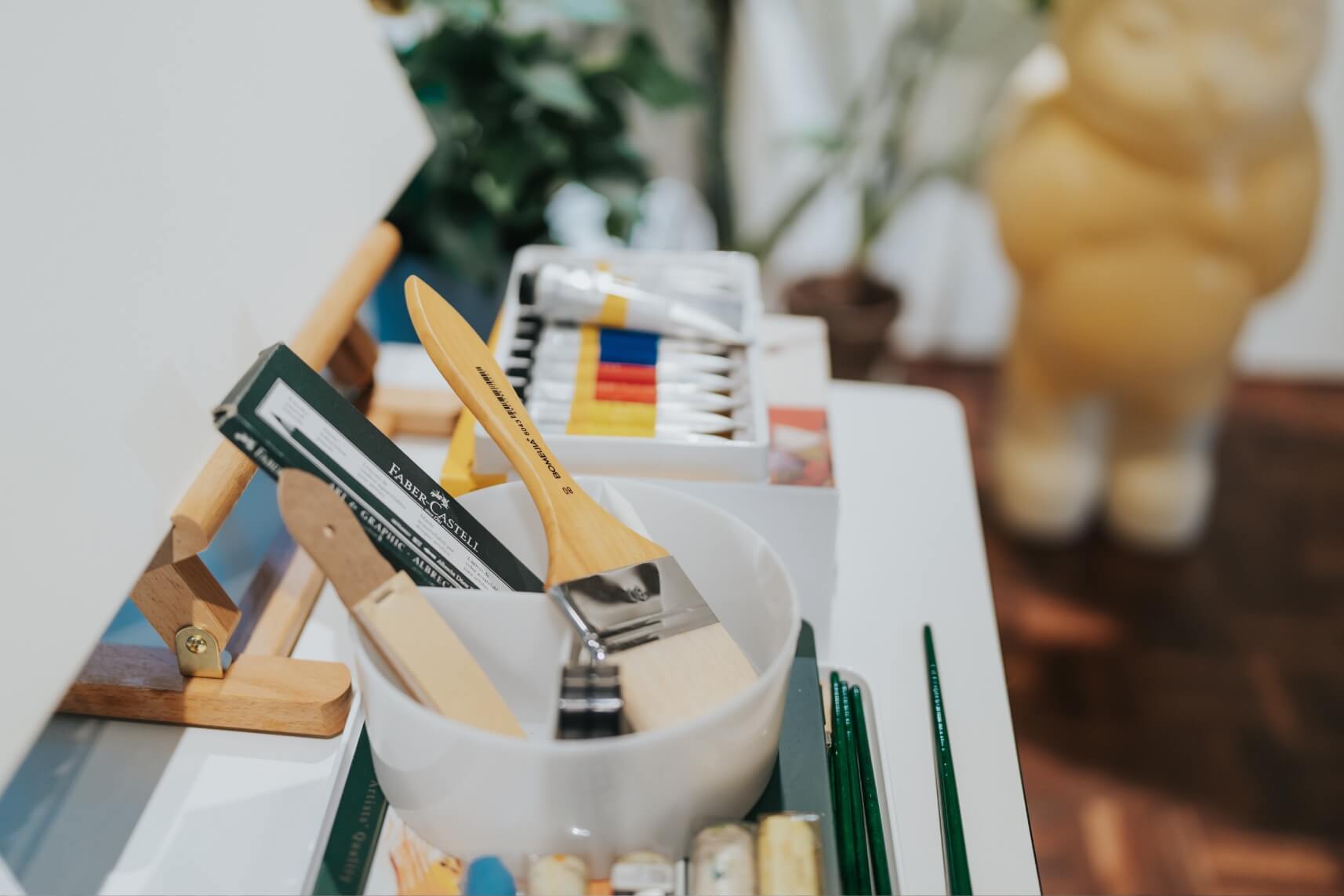 ❸ 畫畫工具|工作室內擺著空白畫板,讓喜歡創作的Josh,空閒時拿著德國知名彩色鉛筆Faber Castell或其他工具作畫。