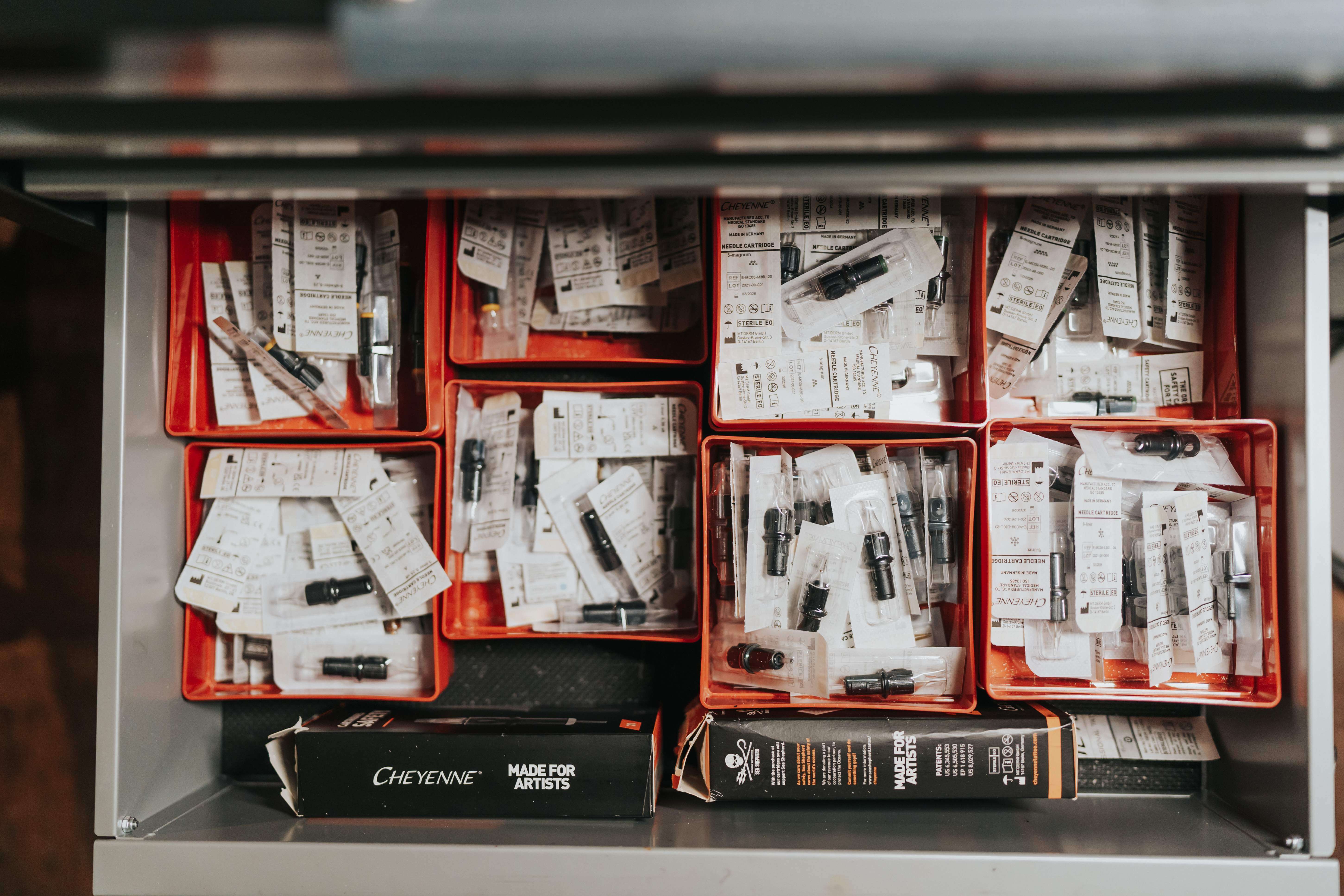 ❹ 刺青針|就像是注射器,刺青針將色料刺進皮膚過程,可能會殘留被刺者的血液,所以為了確保下一位客人的安全,通常是一次性使用。Josh使用的刺青針來自夏安(Cheyenne),無論是平型打霧排針,還是打霧圓針,把針和針嘴合為一體的彈匣針,讓刺青更有效率。