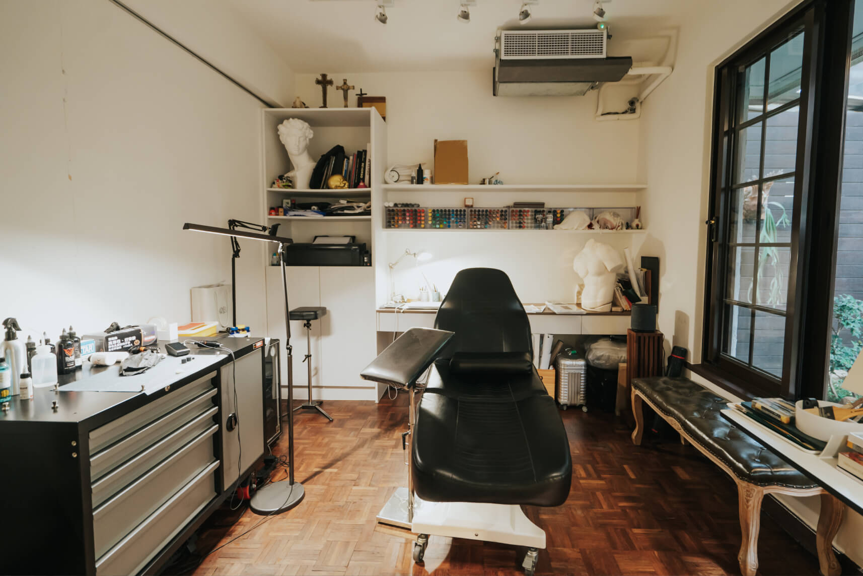 從最初在台北中山區開刺青店工作,至今已過了12年,他換過許多地方為人刺青,如家裡客廳、飯店客房等,也曾在世界各地四處飛行,只要客人在哪,他就提著工具、帶著老婆前往。三年前,從國外返台後先開了私人工作室,後來才又在這裡開設店面。