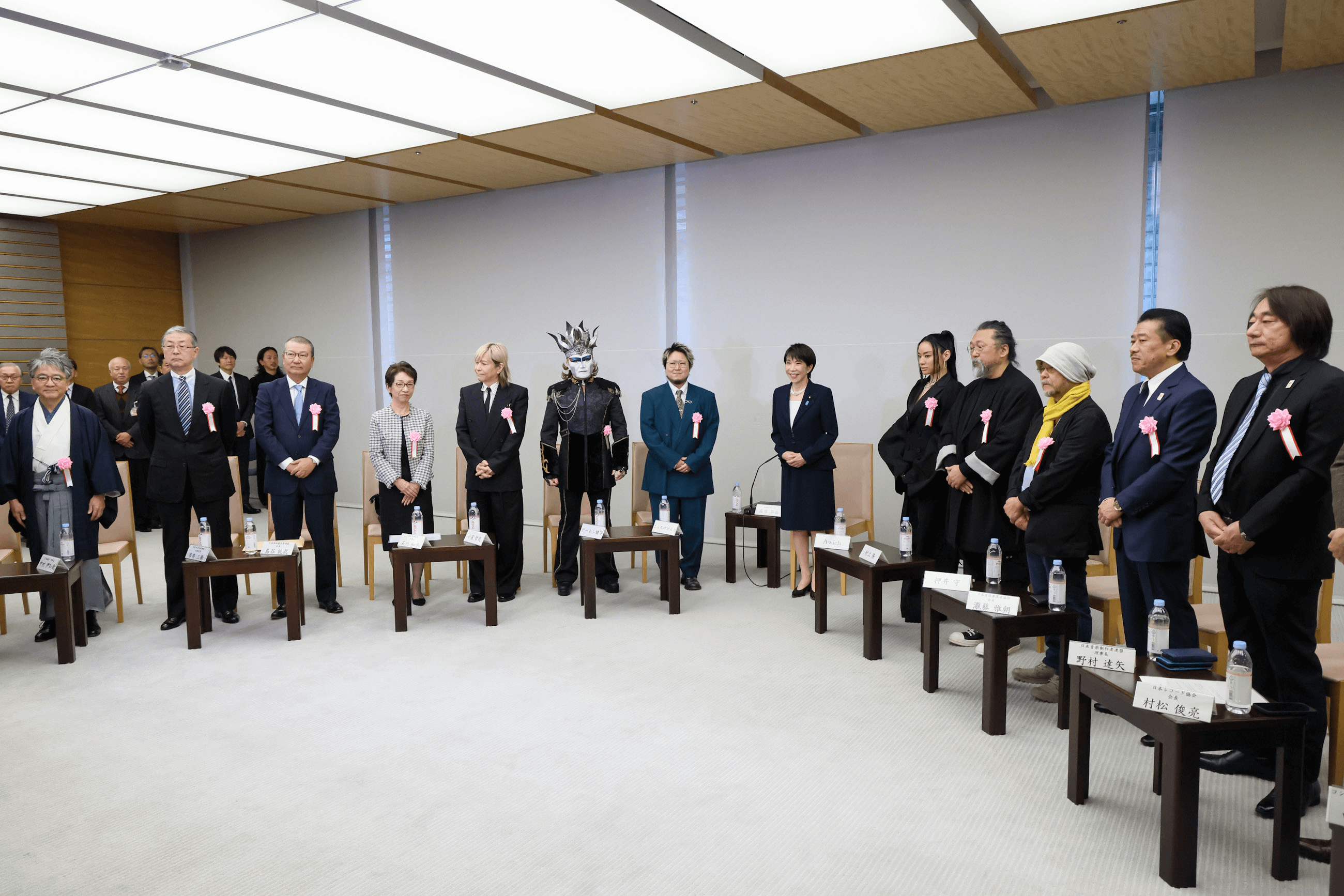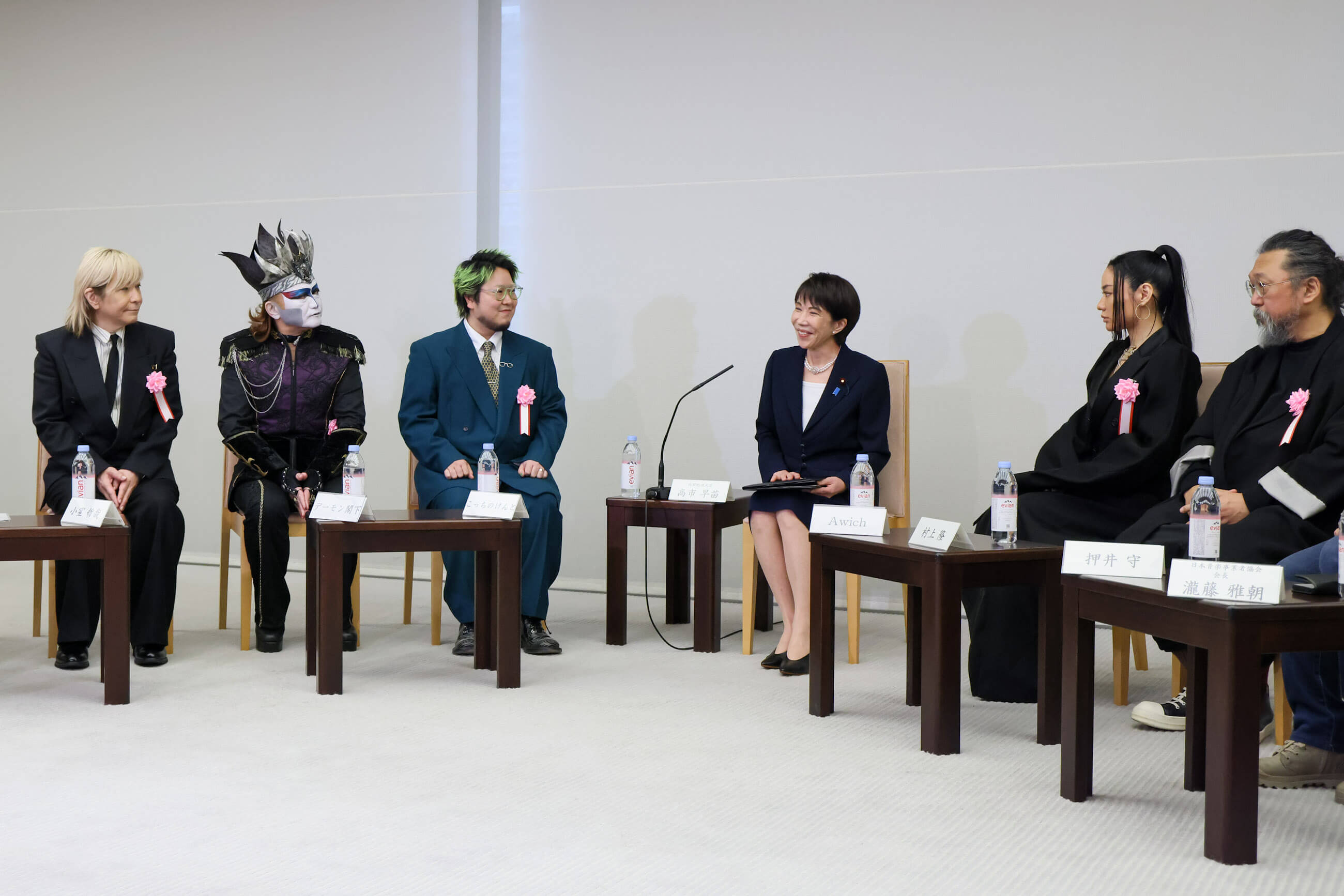 鏡頭裡,坐在首相高市早苗身旁的,不是熟悉的官僚或財界代表,而是一排在日本流行文化史上極具象徵性的創作者:當代藝術家村上隆、動畫導演押井守、音樂製作人小室哲哉、流行音樂創作者菅生健人,以及重金屬樂團聖飢魔II主唱小暮閣下(デーモン閣下,自稱惡魔教教主),饒舌歌手Awich。