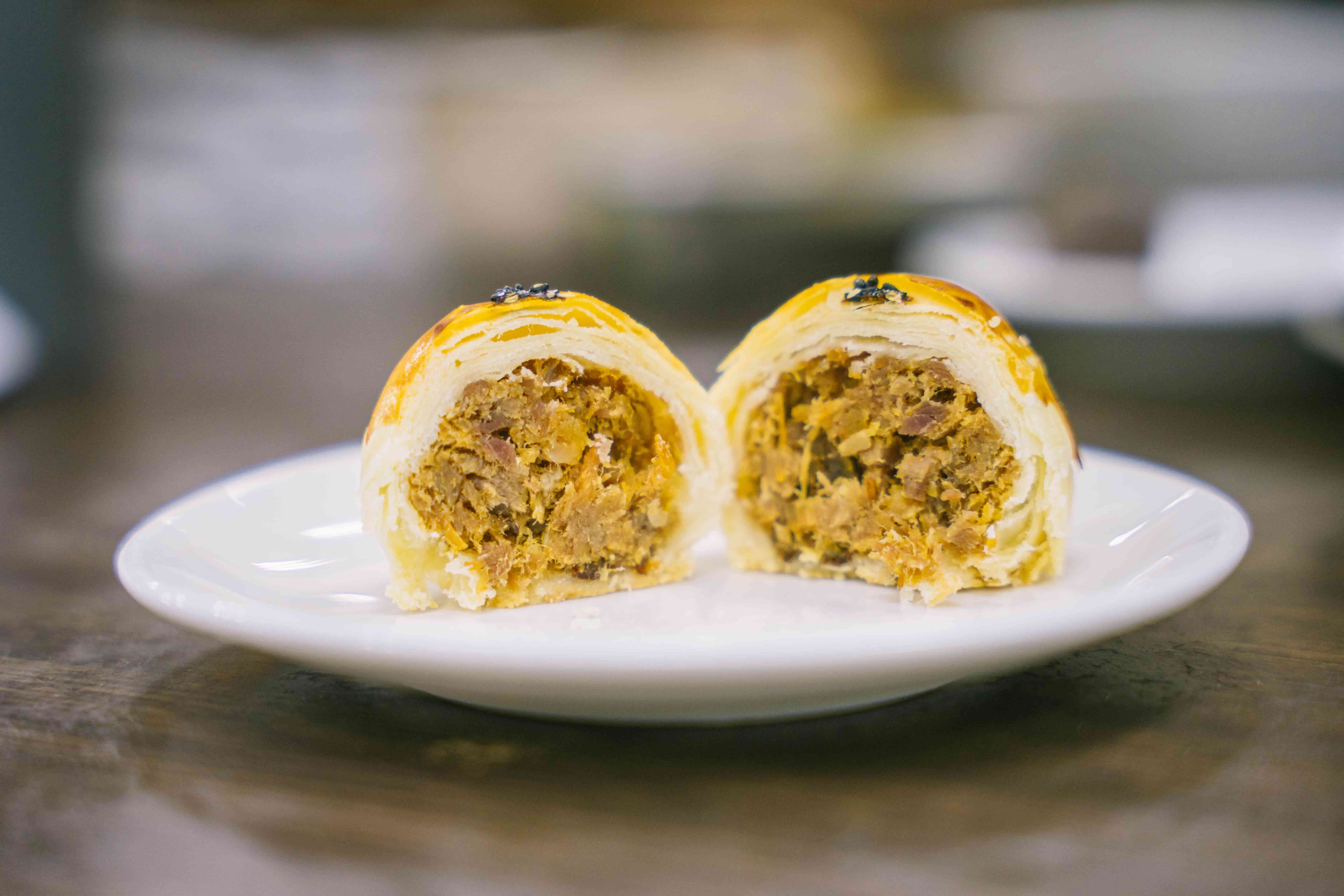 劉家酸白菜火鍋王老闆自行研發的干貝叉燒酥。