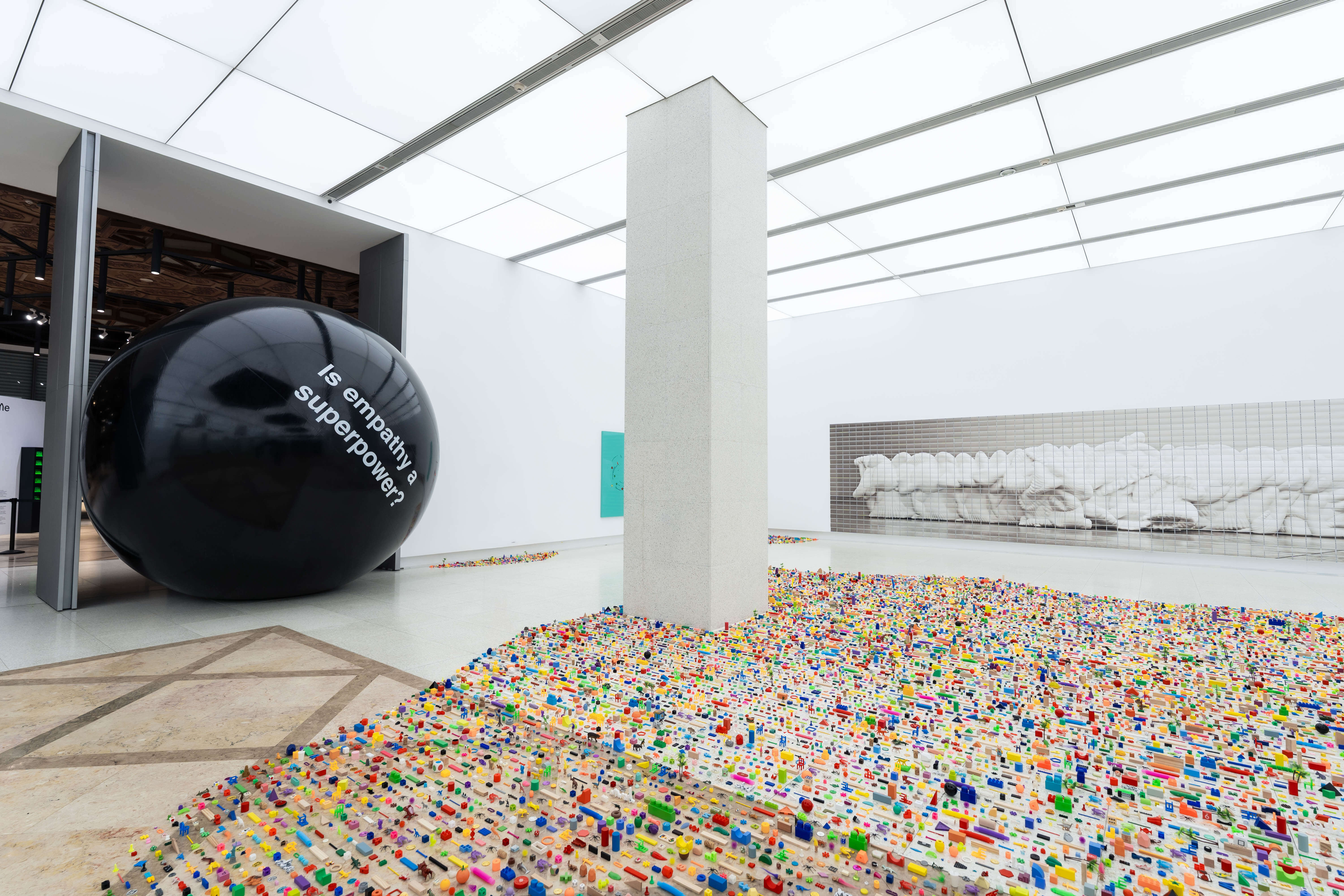 英國當代藝術家瑞安・甘德首次在台灣美術館展出,便以一顆巨型黑色氣球拋出最直接的提問:「同理心是一種超能力嗎?」這位威尼斯雙年展、卡塞爾文件展常客,向來擅長以幽默觀點重新轉化日常物件。他將稚真的問句印在氣球上,刻意置放於展場通道,製造動線上的阻礙,迫使每位經過的觀眾直面這個來自孩童般的追問。這並非裝飾,而是一種溫柔的暴力──當你試圖繞過或推開它時,也同時在回應這個問題:我們是否真的能理解他人?