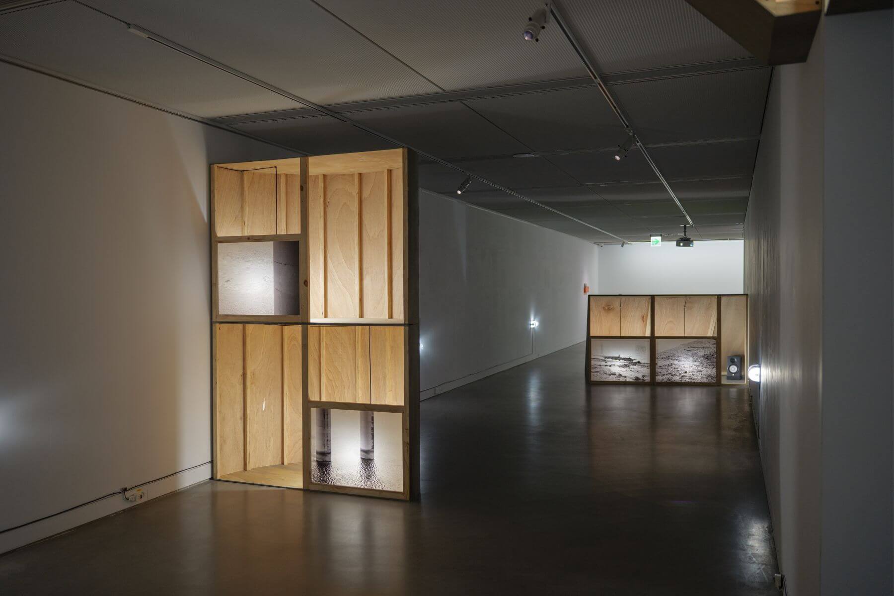 馬來西亞藝術家楊健生則是在來台駐村期間,發現所住的地方,前身為警察宿舍與兒時成長的「華人新村」建築外牆都使用雨淋板。無論在台灣或是馬來西亞,這項技術皆由殖民者引進。因此他將雨淋板以百葉窗的造型呈現,大面積覆蓋美術館入口處的落地窗。以馬達帶動的窗簾拉繩,因玻璃百葉窗傾斜角度的差異和馬達轉速的快慢,和百葉窗之間產生不同音高的聲響,此起彼落迴盪於展場。藝術家將木建築中帶有節奏感的視覺構造,轉化成聲音 ,同時藉由聲音來製造過去與現在交疊的記憶。
