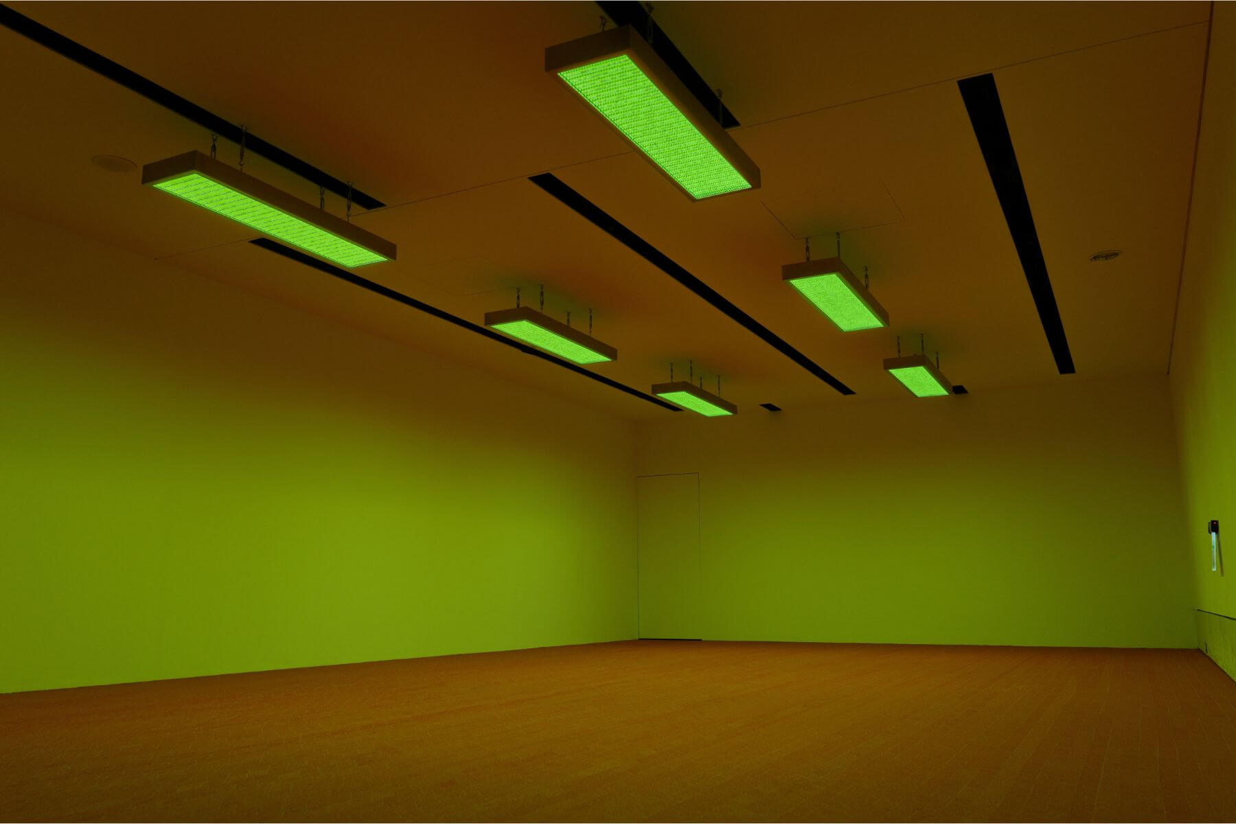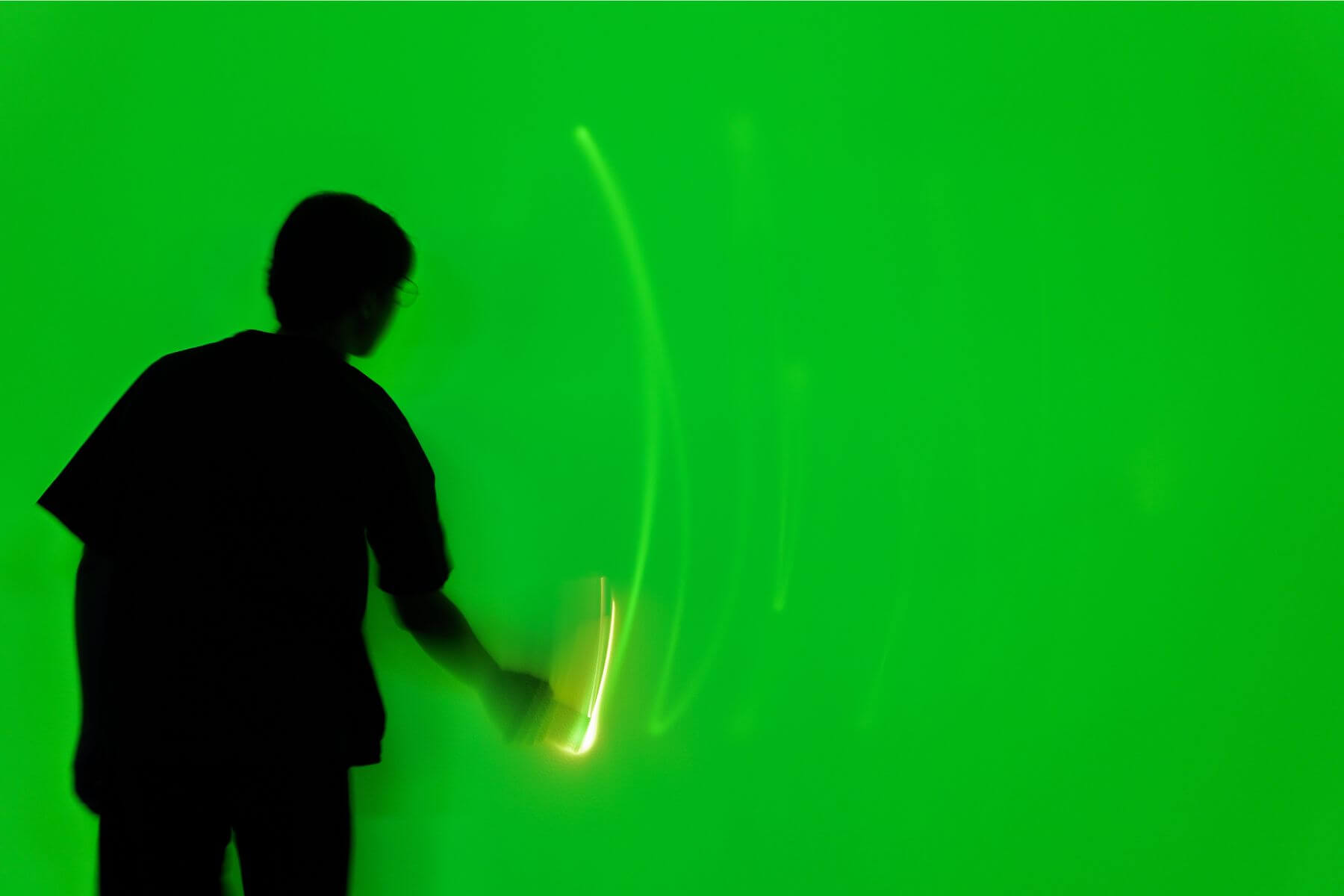 同樣這種異於日常體驗的關係,也展現在曾於台北當代藝術博覽會展出的德國藝術家 Olaf Nicolai 的作品《如何想像蠟燭熄滅後的光》。他擅長在空間裝置內,藉由變化媒材的特性,對日常瑣事和既定認知提出圍觀的論點,利用觀者的直覺為支點,放大和提醒特定的感知。在這件沉浸式的互動裝置裡,當觀眾步入暗間時,用光探索的痕跡將留在另一面由紫外線燈照射的牆裡,彷彿捕捉光和時間。