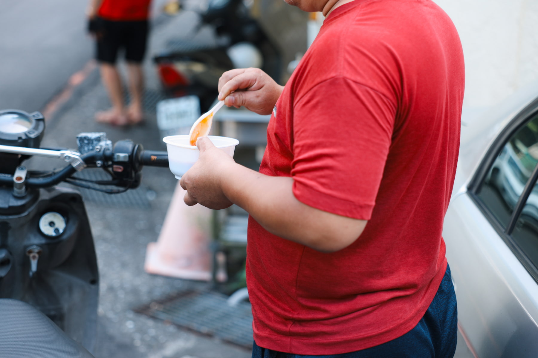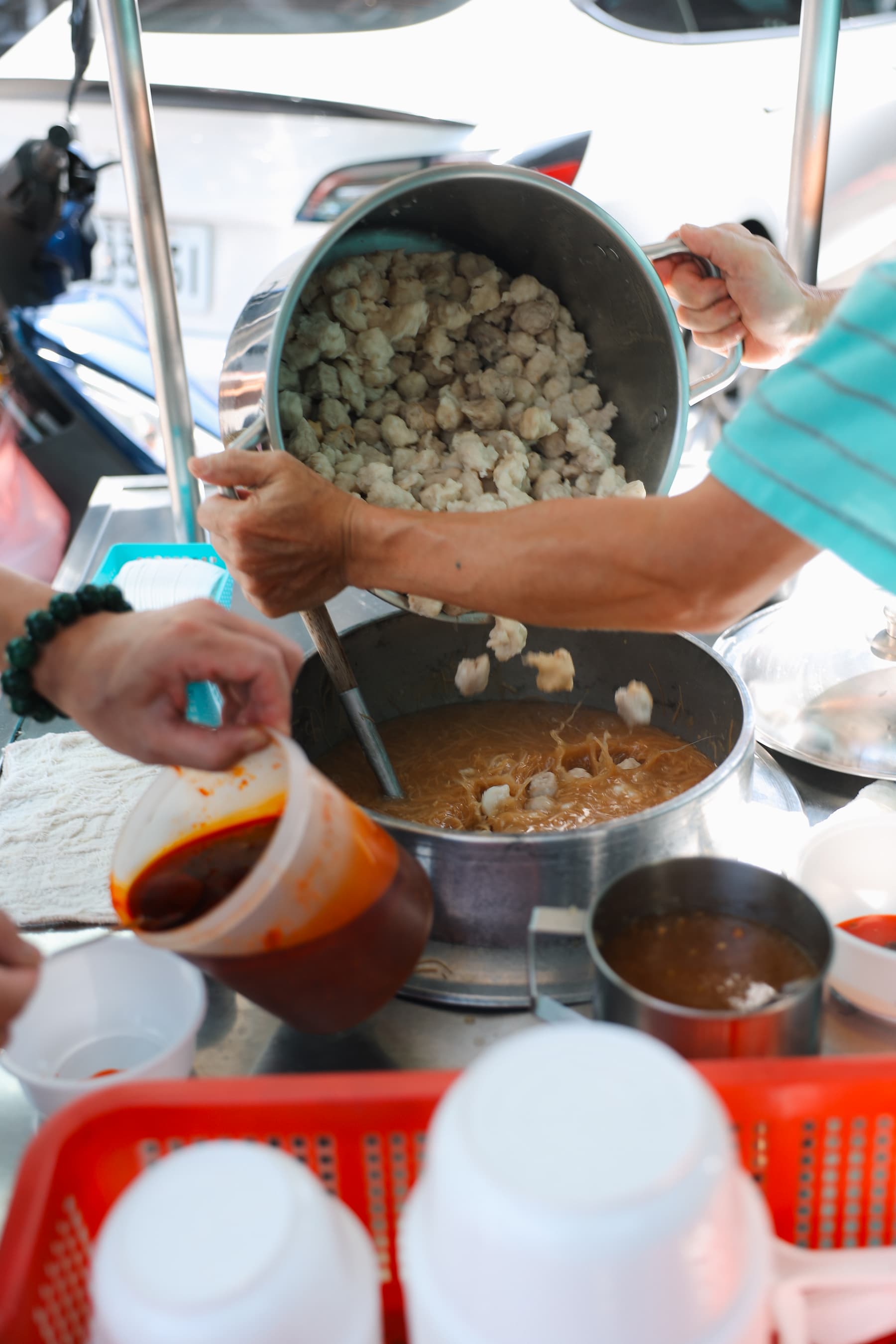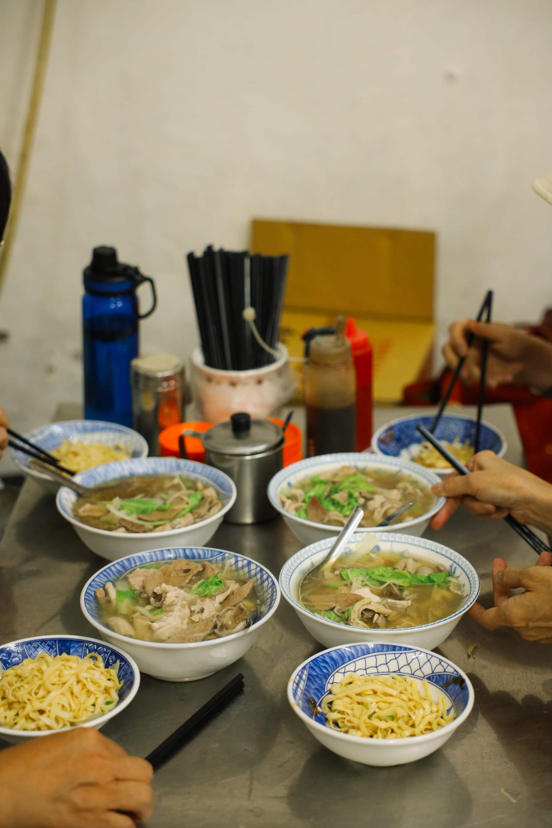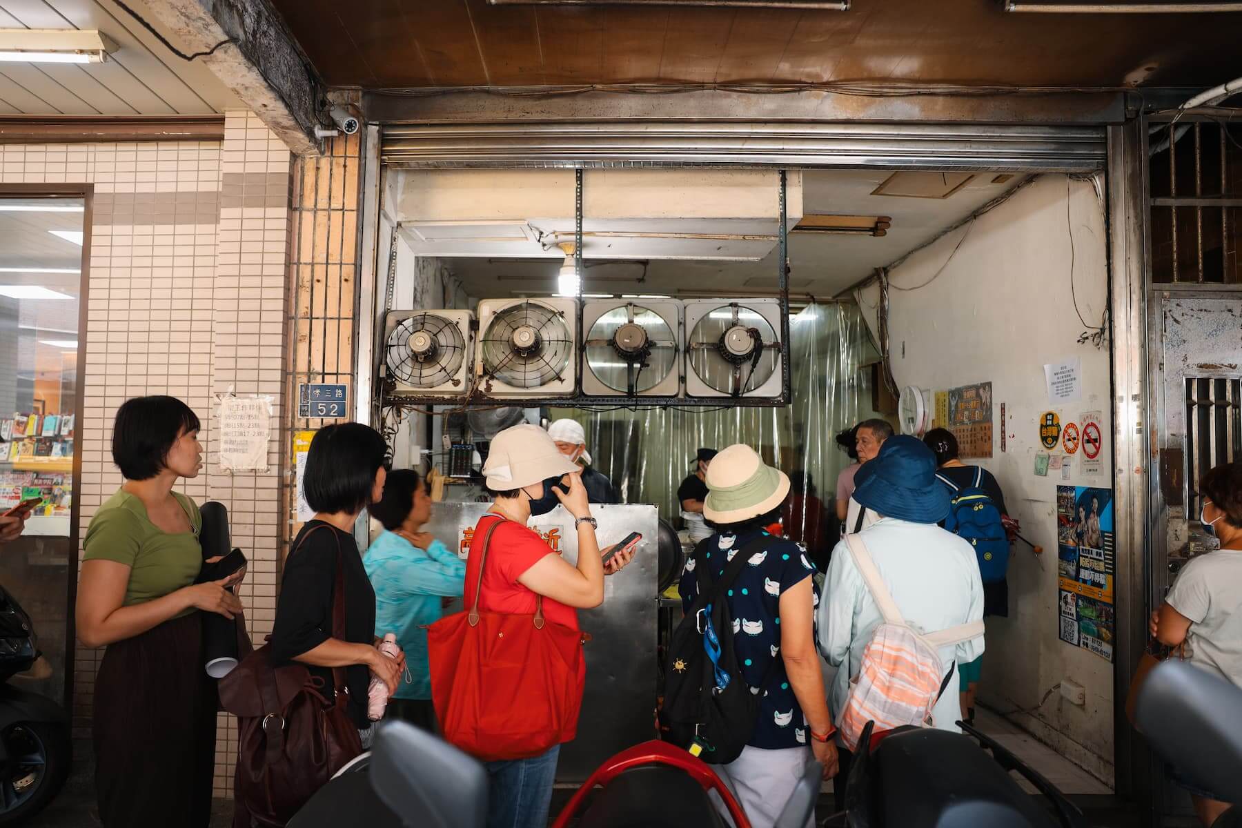 麵線攤位原本在巷口,後來路邊畫上了紅線只得退到巷裡,下午2點半才開賣。正是日頭正炙之際,想在現場吃就得自個兒捧著碗頂著豔陽立食,熟門熟路的客人則會貼著隔壁樓房牆壁站好。