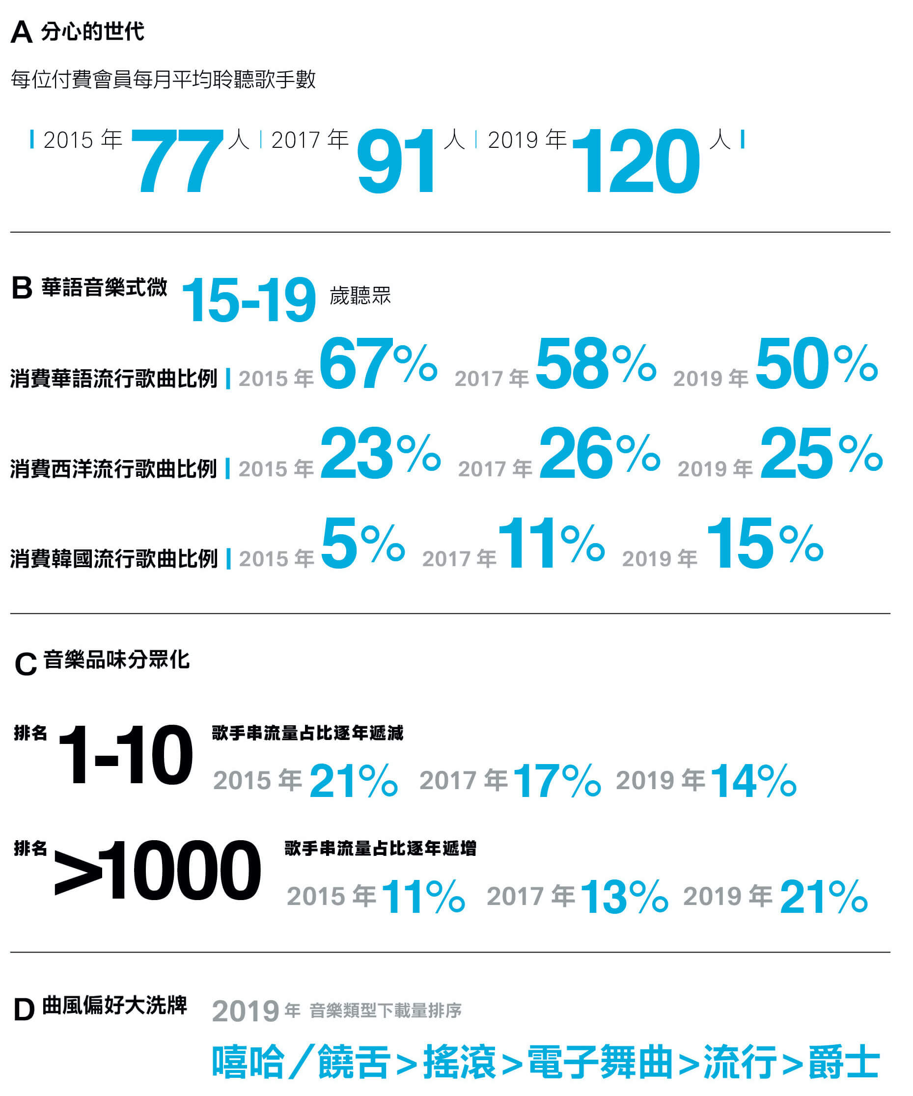 一個明顯的趨勢是台灣的流行音樂式微。2005年KKBOX上線時,以港台歌手為主的華語流行音樂,占整體串流量的75%。可解讀為,當時的用戶花超過七成時間收聽華語音樂。到了2019年,這數字已大幅下滑至50%。