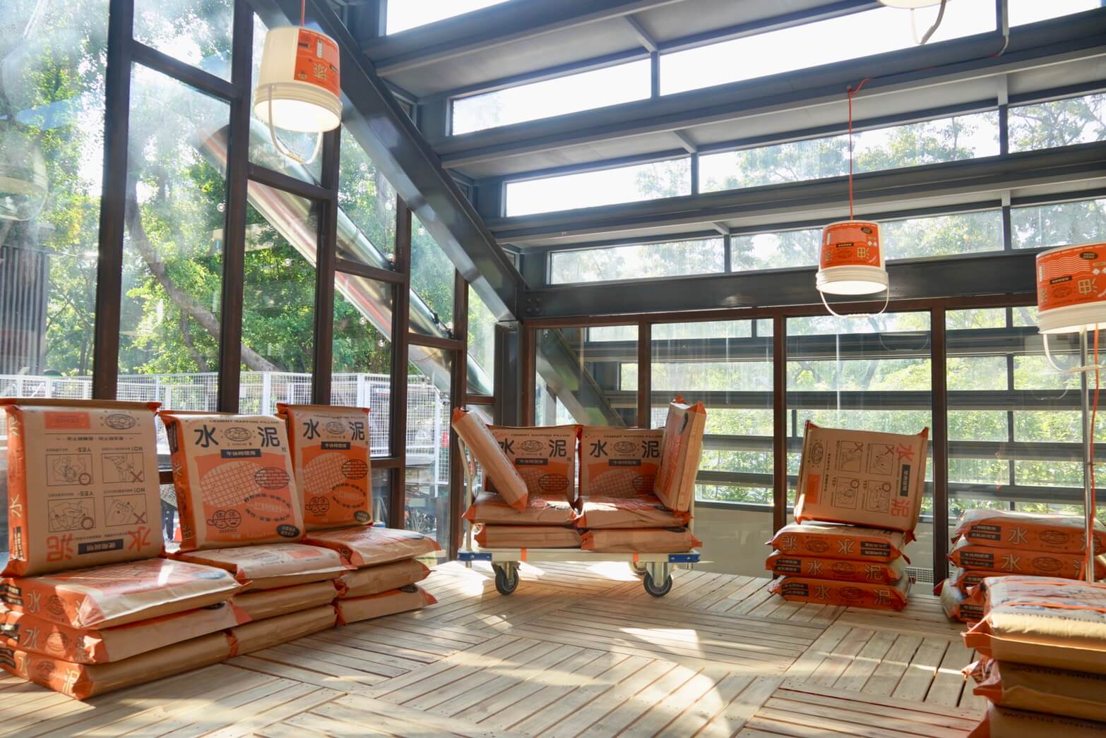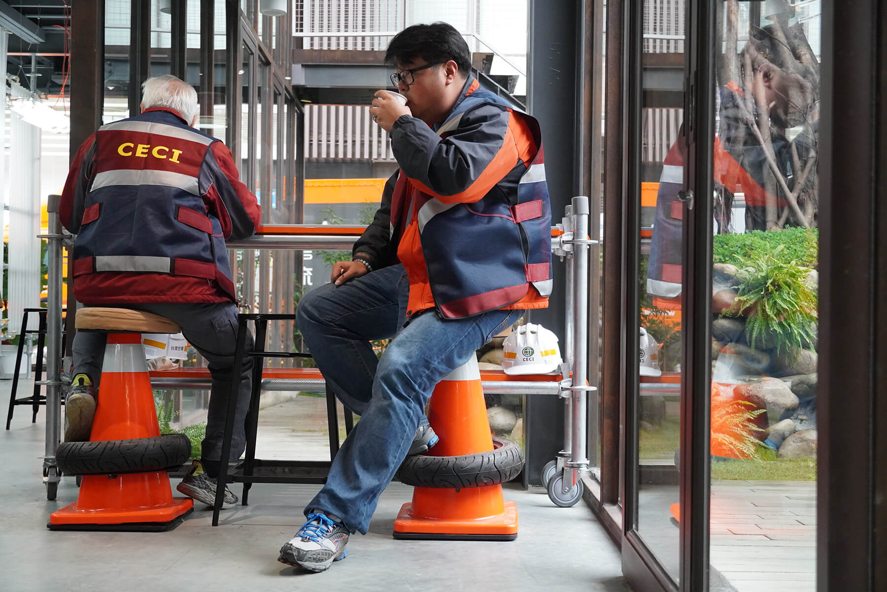 吳孝儒則自工地取材打造內裝,像是鷹架搭起的食桌、以輪胎加固的角錐椅,形隨機能,充滿了別出新裁的趣味。提供給工地師傅的餐點,由台中餐飲品牌好食慢慢設計健康營養的便當,並開發一系列工地特調飲品。。