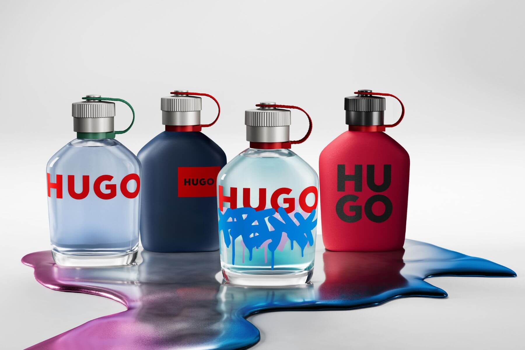標誌性的 HUGO 水壺瓶身這次變成了畫布。透明玻璃上,醒目的藍色 KRINK 標籤與紅色 Logo 形成強烈對比;瓶身背面更燙印了指標性的「滴墨圖案」,讓這瓶 Hugo Boss 香水就像一件街頭收藏品。