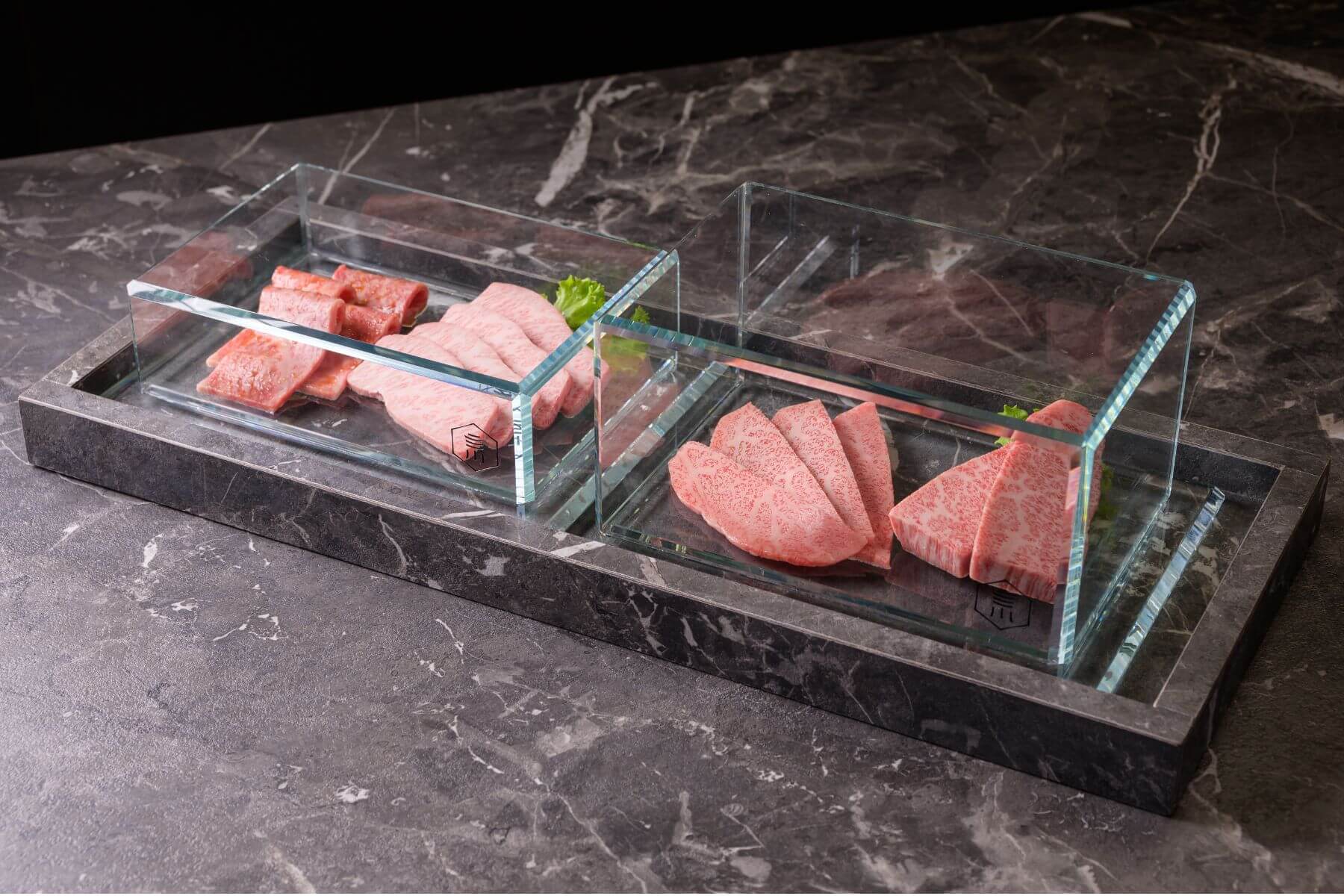嚴選原產地日本、等級BMS10的A5和牛(BMS=Beef Marbling Standard脂肪紋理分布,最高級別12),京燒肉主打和牛套餐,並以透明水晶盒盛裝精選部位,和牛風味不光是大理石紋般的油花霜降口感,更依照整體用餐感受挑選不同的和牛部位搭配,帶來入口即化、油花馥郁與清爽赤身等多元層次的高級饗宴。