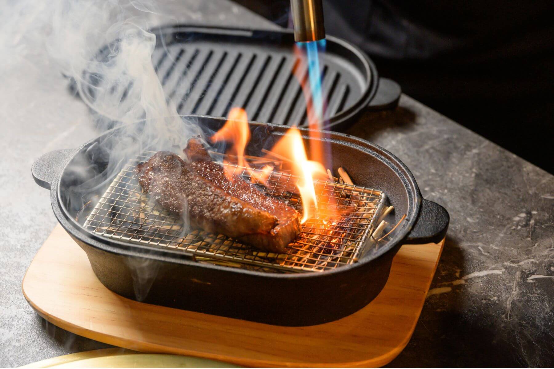 除了吃得到來自鹿耳島、宮崎等不同層次的和牛部位,料理長檸檬主廚也設計了以和牛搭配其他食材的特色料理,如色香味俱全的「稻燻炙燒和牛」,煙燻瀰漫的香氣,搭配酥脆黃金蒜片一起享用,讓人口水直流,亦或是「月見日本A5和牛」,蛋香和特調醬汁,佐以入口即化的頂級和牛,讓人垂涎。