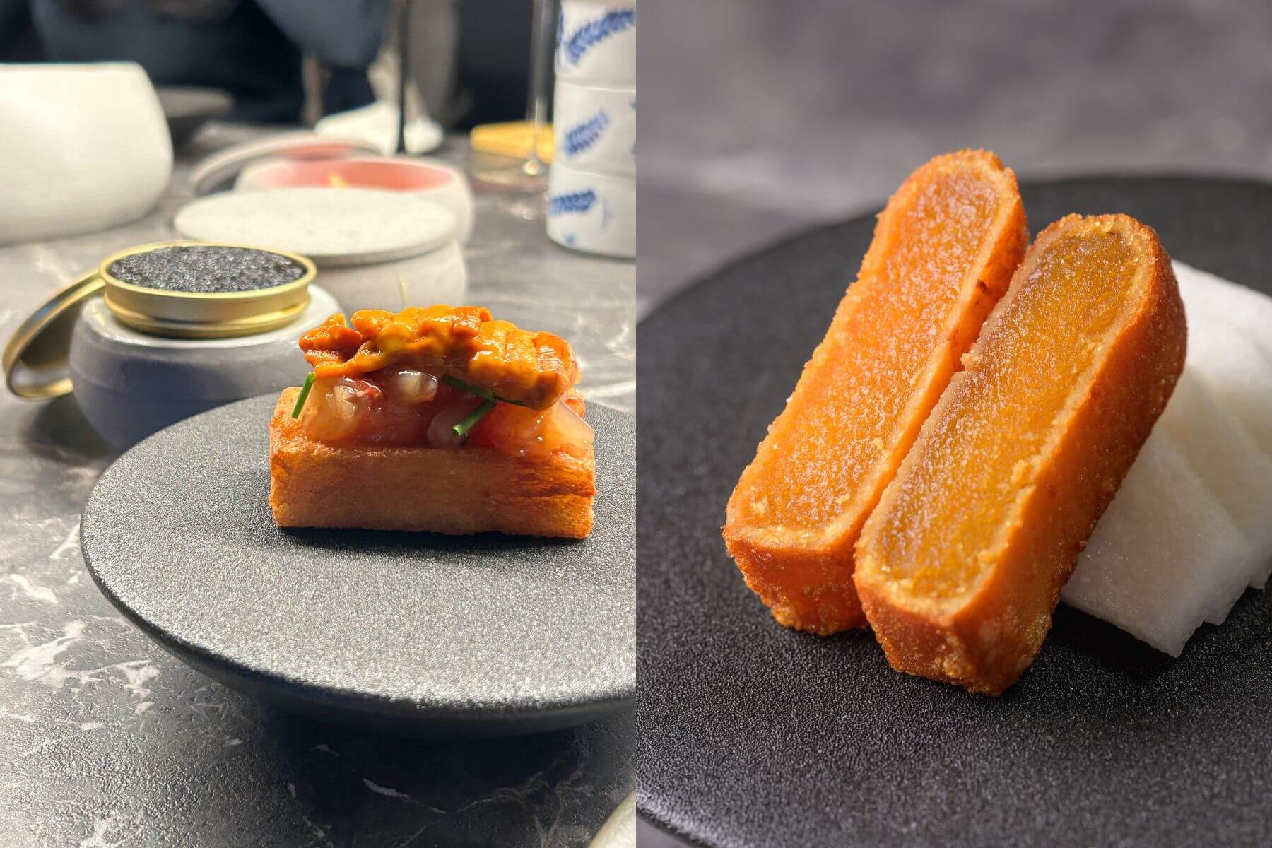 以高規格的日本A5和牛為雙人套餐的核心,並巧妙融入許多日料、法餐的元素,前菜選項之一的「獺祭漬烏魚子」,以清酒入菜的黃金溏心,滿滿的幸福滋味;主廚推薦的「奶油吐司」堆疊海膽、生胭脂蝦,搭配特製海苔魚子醬,完美帶出海鮮的鮮與甜;最後上桌的昭和布丁和栗子麵茶提拉米蘇作為收尾的甜點,更是完美收服老饕的靈魂。
