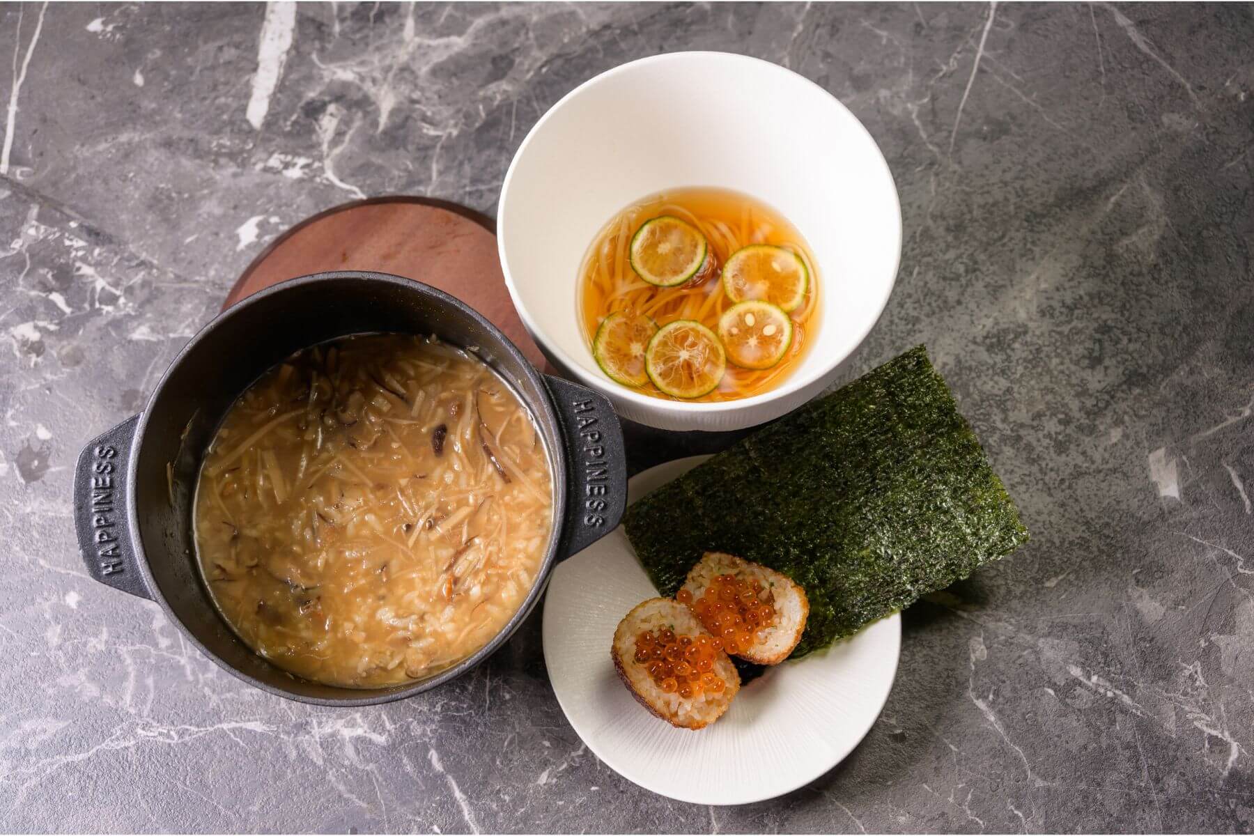 許多燒肉控認為燒肉配白飯才是王道,料理長檸檬主廚選用被譽為「夢幻之米」的北海道夢美人白米飯,更是ANA全日空航空頭等艙的指定米。暖心又暖胃的「古香春筍粥」帶有濃郁的甜味和溫潤的口感,是一碗有媽媽味道的古早味鹹粥;而來到京燒肉必點的還有「鮭魚卵炸飯糰」,靈感來自檸檬主廚年輕時在新都里工作,日本料理長為當時年事已高、從一粒米白手起家的台灣經營之神王永慶手工製作的庶民美食,將飯糰在鐵板上煎到金黃酥脆,簡單美味的純粹曾讓已逝的台塑集團創辦人稱讚不已。