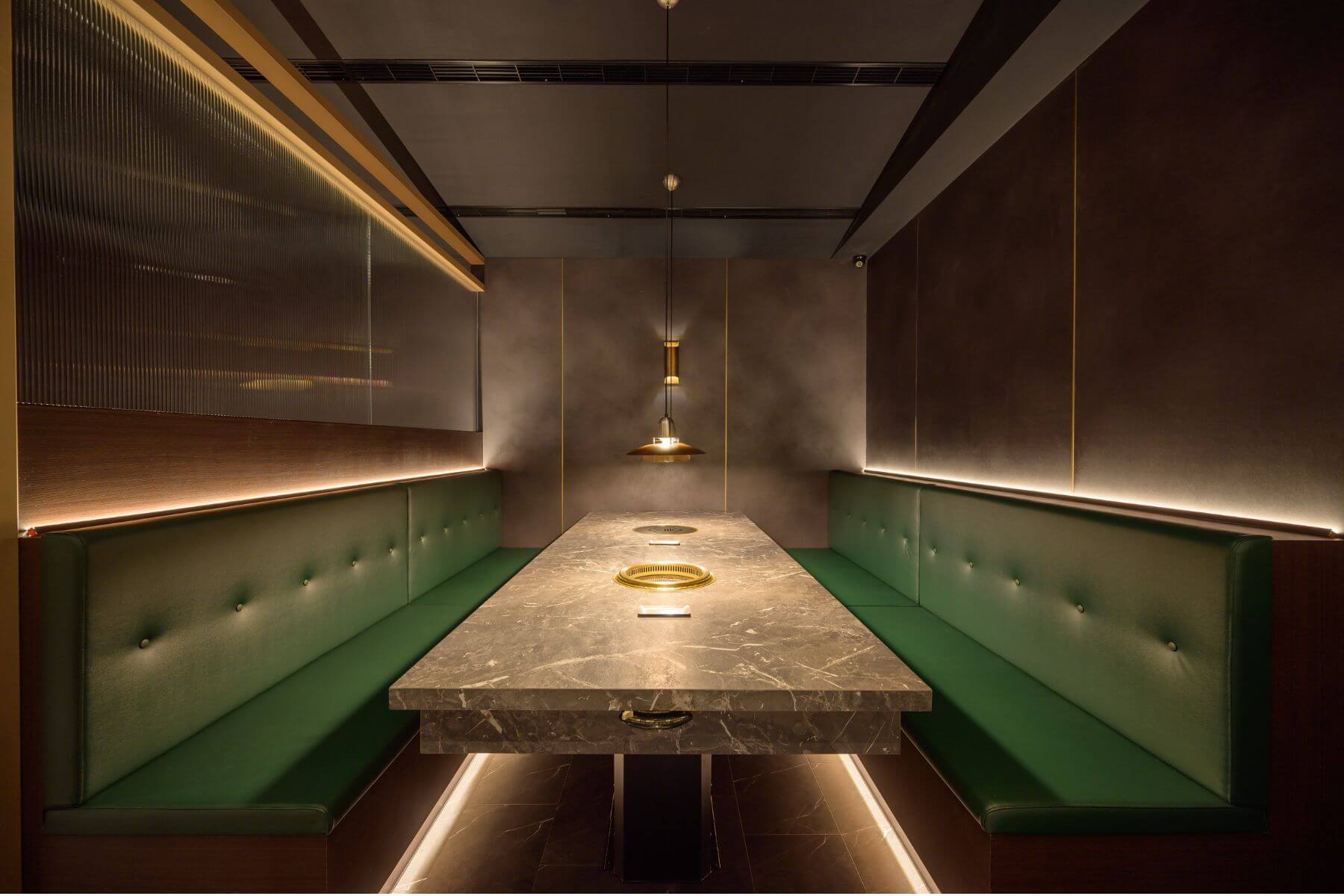 位於台中心臟地帶的京燒肉,空間以黑金底蘊為主軸,設計融合黑色基調與精緻金屬細節,將極簡美學與奢華氛圍完美結合。每一處細節,從燈光布局到桌椅擺設,無不傳遞著低調洗鍊的時尚語言。地點位於台中燒肉餐廳的一級戰區,氣派大門選用昂貴的鈦板,重達600多公斤,鋼鐵般強硬質地,金屬般華麗光澤,宛如秘密城堡的通道,進入這座燒肉天堂。而服務台後牆上的進口花崗石牛頭圖案,清楚明瞭地展現京燒肉的明星主角。