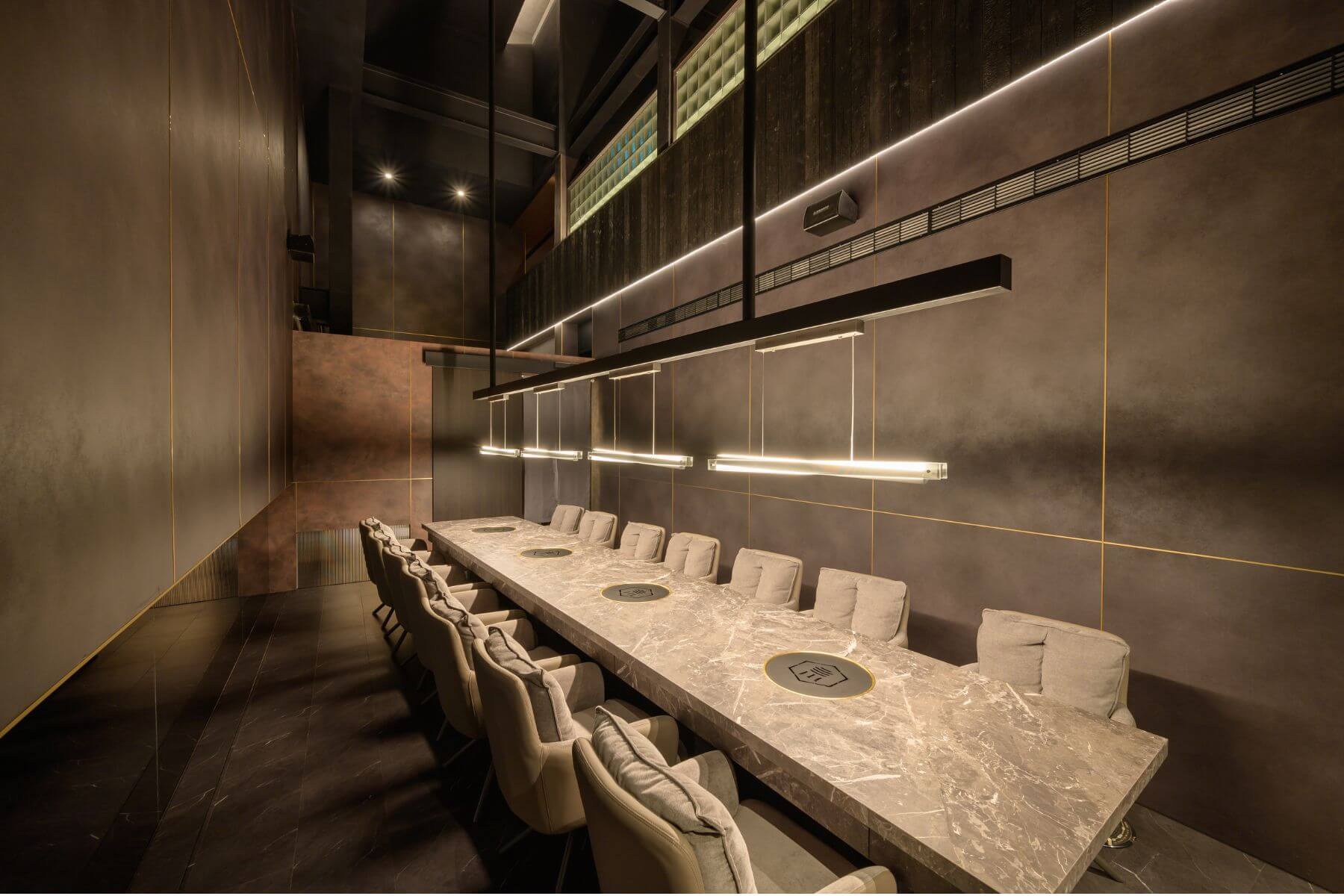 除了裝潢設計風格低調奢華,市內空間也特別打造帶有神秘感的隱私空間,宛如市中心的私人招待所。一樓入口處挑高三層樓、長型的獨立包廂,安排12-14個席位;一二樓分為五個開放式座位區都能包場,成為具有隱私的類包廂,容納16人以上、多達28人,為喜愛熱鬧的消費者提供中小型聚餐宴客的好去處。