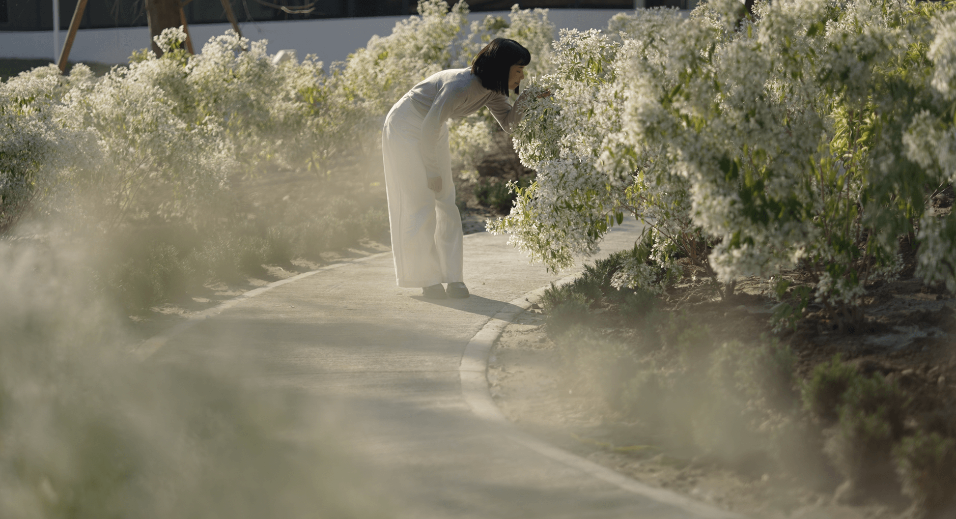 花園的設計由景觀團隊「山下植美」操刀,切入角度是「野性美學」——不是工整的花圃,而是接近植物自然生長狀態的混植景觀。銀白系的白雪木、銀絨野牡丹與銀葉鈕扣樹打底,讓光線在亮色葉面上形成漫射,視覺上像霧又像光;藍星花、非洲鳶尾穿插其間,以纖細的莖葉捕捉風的動向。
