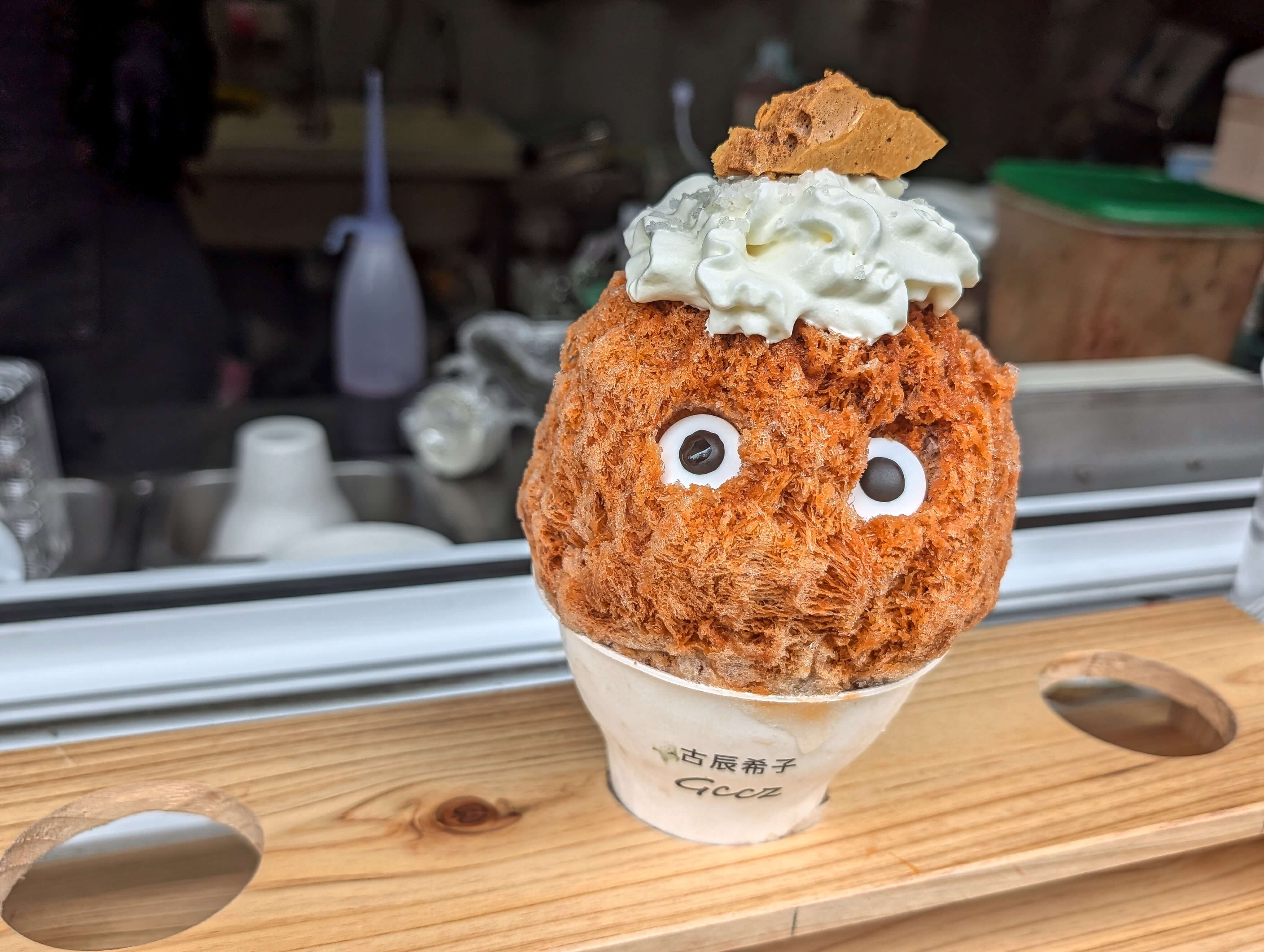 甜點區有兩個值得關注的品牌。「樹下吃冰」是微熱山丘孵化的新品牌,主打鳳梨冰沙與九九峰限定的氦氣球、獨角仙造型雞蛋糕;古辰希子從台中一中商圈出發,把職人日式刨冰帶進山林,限定口味以氣球命名。
