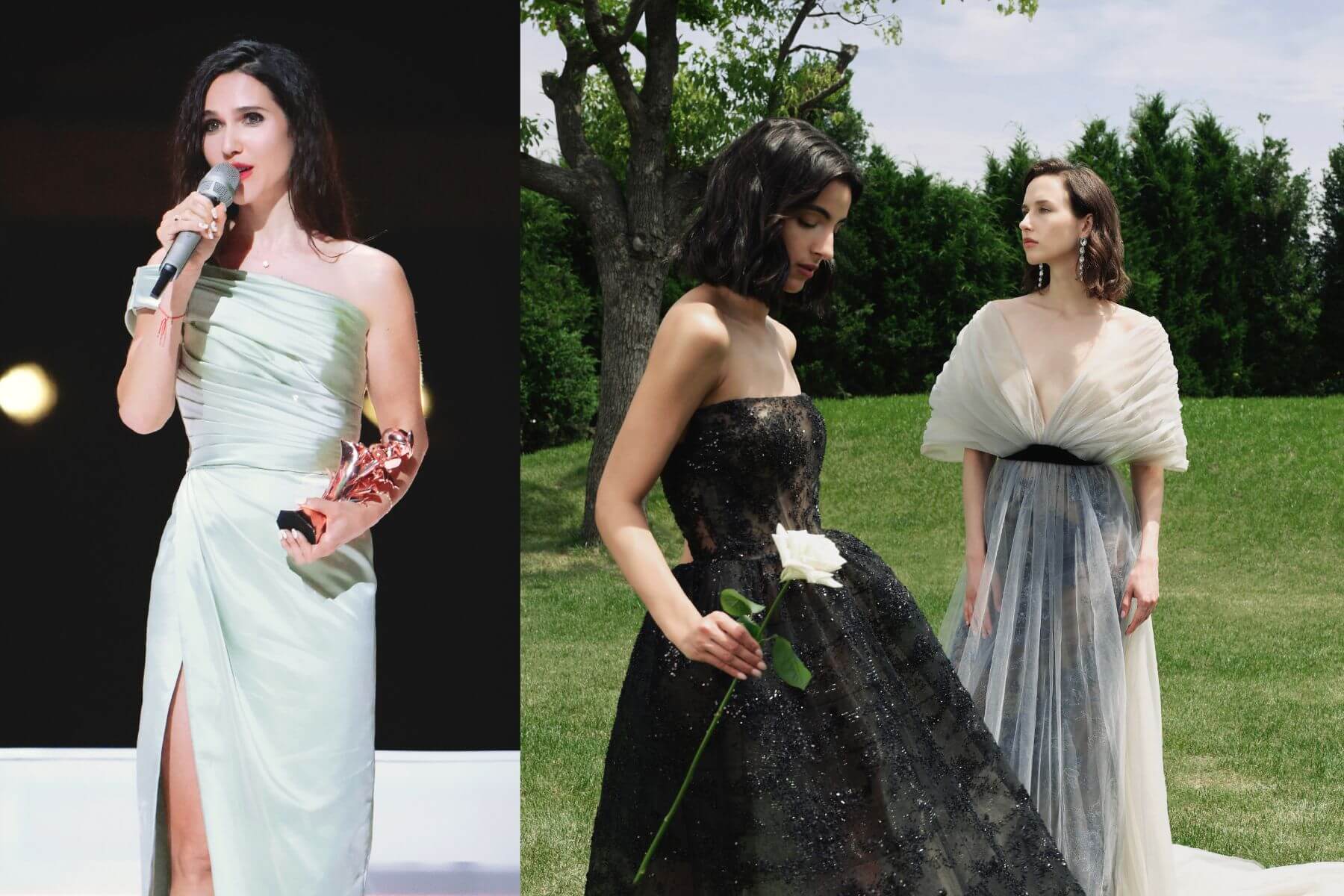 在色彩上,淺藍與霧灰薄紗交錯下、手工打造出的浪漫立體薔薇;熱情酒紅色輕細紗所構造的立體廓形,由側身延展而成的流線型包裹全身,傳遞僅有訂製禮服手工才能傳遞的獨特魅力。