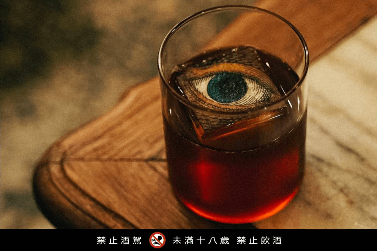 其中一款調酒名為「深淵」,小白解釋道,除了喜愛的樂團八十八顆芭樂籽有首同名歌曲,也是出自尼采說的一句話:「當你凝視深淵時,深淵也在凝視你。」來自哲學、音樂的觸動,小白將其轉化成調酒,傳達至客人的酒杯中。於是,他手繪一隻瞳孔深黑的眼,印出鋪在冰塊上,放進以黑豆蔻、咖啡、錫蘭紅茶製成的調酒中,當客人拿起杯子時,深淵之意便能直接打進客人心中。