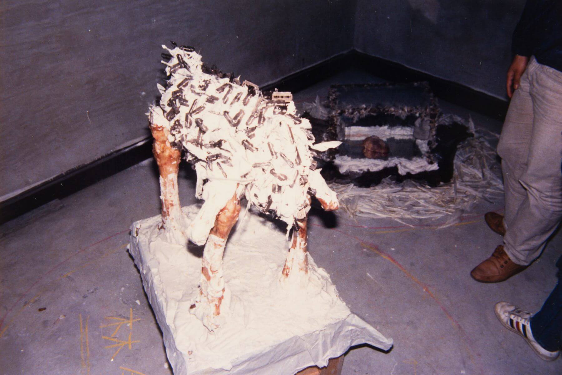 林鉅也是「息壤」的創始成員,他喜歡與這些他眼中有料的台北文青混在一起,但他仍以圈外人自居,「我只是跟著這群藝術家們蹭酒喝,他們太聰明了,相較之下,我都在胡搞。」第一屆「息壤1」展覽現場,林鉅把刮鬍刀片插在牛骨上、把豬心放進玻璃展示櫃,這些骨架內臟是他開展當天一大早才去市場肉舖買的,「展出沒幾天,整間屋子都是怪味,還有蒼蠅飛來飛去。」