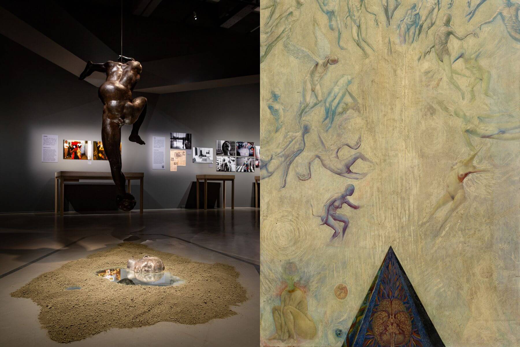 80年代的台灣藝術家開始嘗試各種跨域性的素材與概念實驗,左圖為高重黎《回記憶中幻想家族肖像》(1988);右圖為林鉅《中陰徙境圖》(1987,大未來林舍畫廊收藏)。(圖片/臺北市立美術館提供)