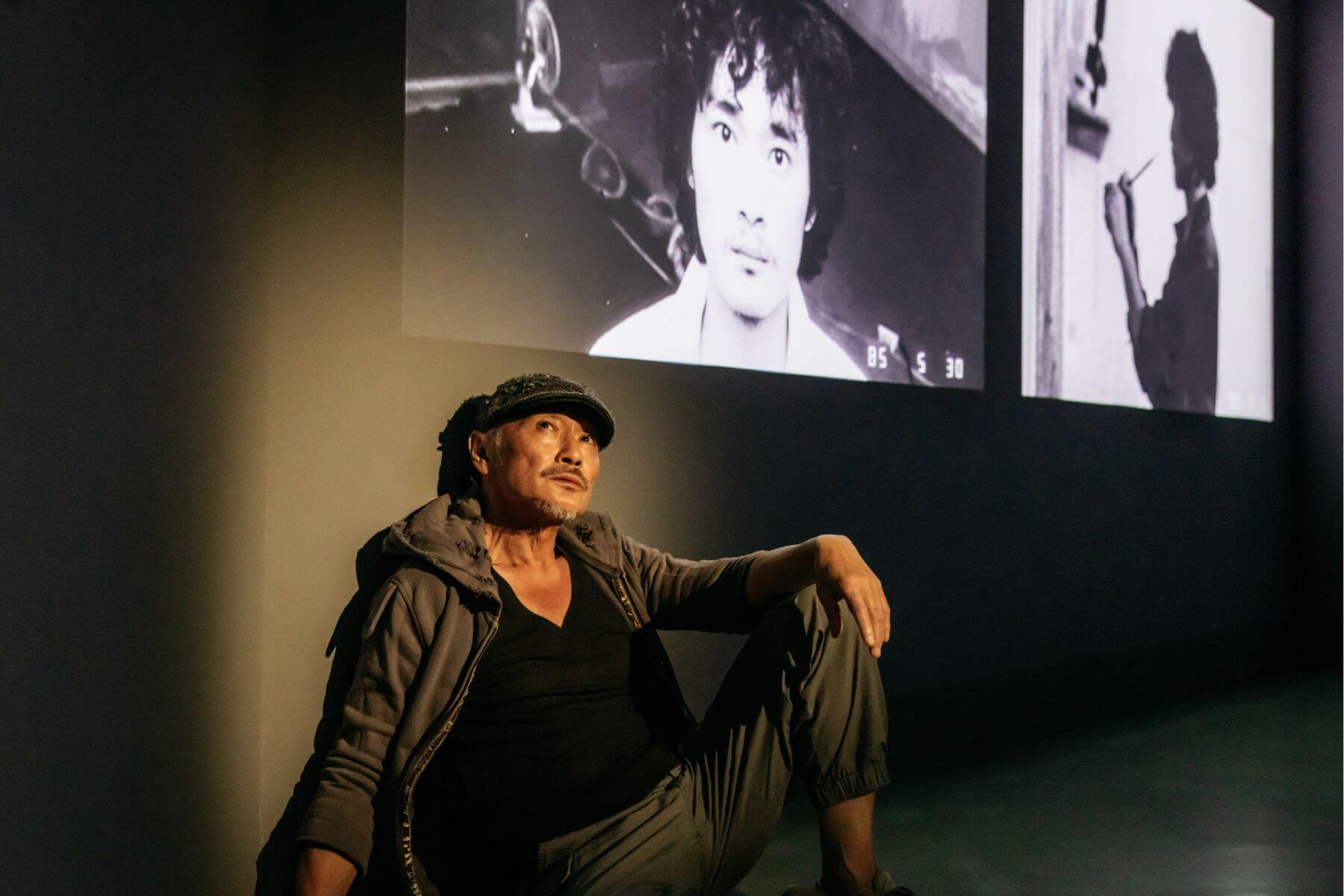 藝術家林鉅位於北美館「狂八〇:跨領域靈光出現的時代」特展中,與自己年輕時的影像紀錄合影。(攝影/汪正翔)