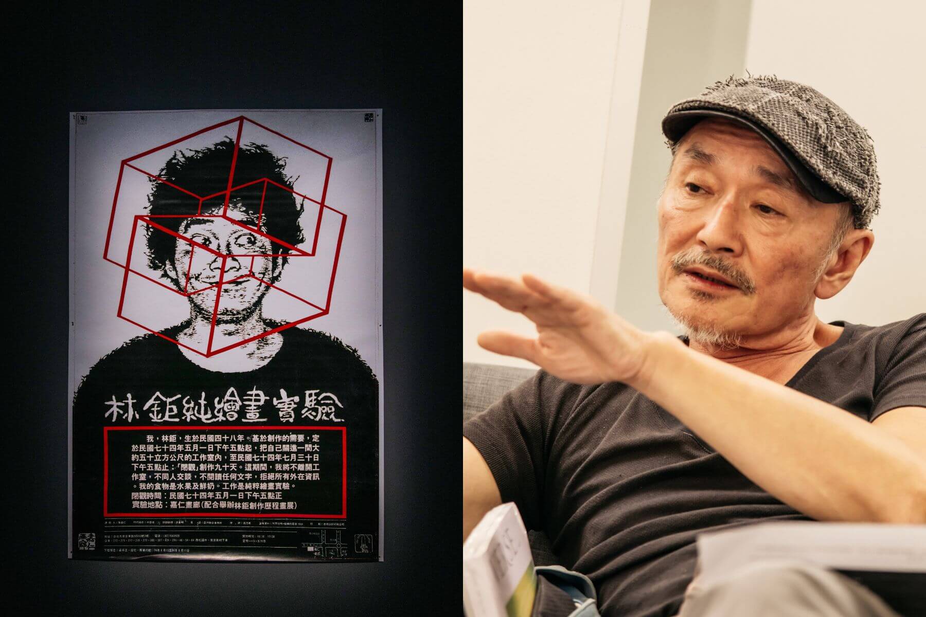 「唉但我覺得那次是個很糟的行為藝術,我當時只是想搏版面啦!」在保守的年代引起騷動熱議,林鉅只記得自己那時瘦了快二十公斤。在「狂八〇」展覽中,他年輕時的黑白肖像被投影在牆上——燙了頭捲髮,瘦瘦的身軀打著赤膊,鬍渣與眼神藏不住靈魂裡的文藝氣質,不像狂人,倒像個搖滾明星。