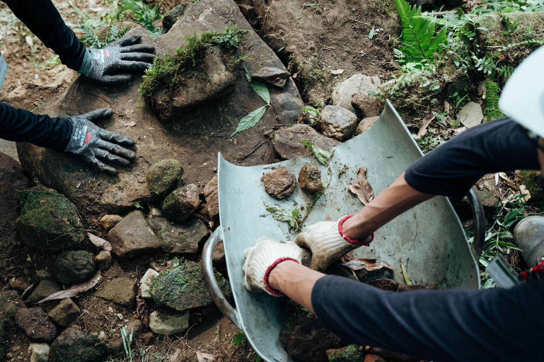 在步道師的指揮下,志工們紛紛往山溝找尋大小不一的石塊,再合力以網袋搬運至步道。接下來,有人搬移散亂的石階與崩塌的駁坎砌石,有人開鑿不平整的岩盤,有的為石塊媒合形狀,有人拿鐵畚箕裝來備填用的碎石砂土,有人拿小鎚打石,有人鋪設石階,有人在步道路面設置導流用的水道⋯⋯就像徐銘謙所說的,一群志工井然有序地分工合作,看不出他們大多數人並沒有施作經驗。