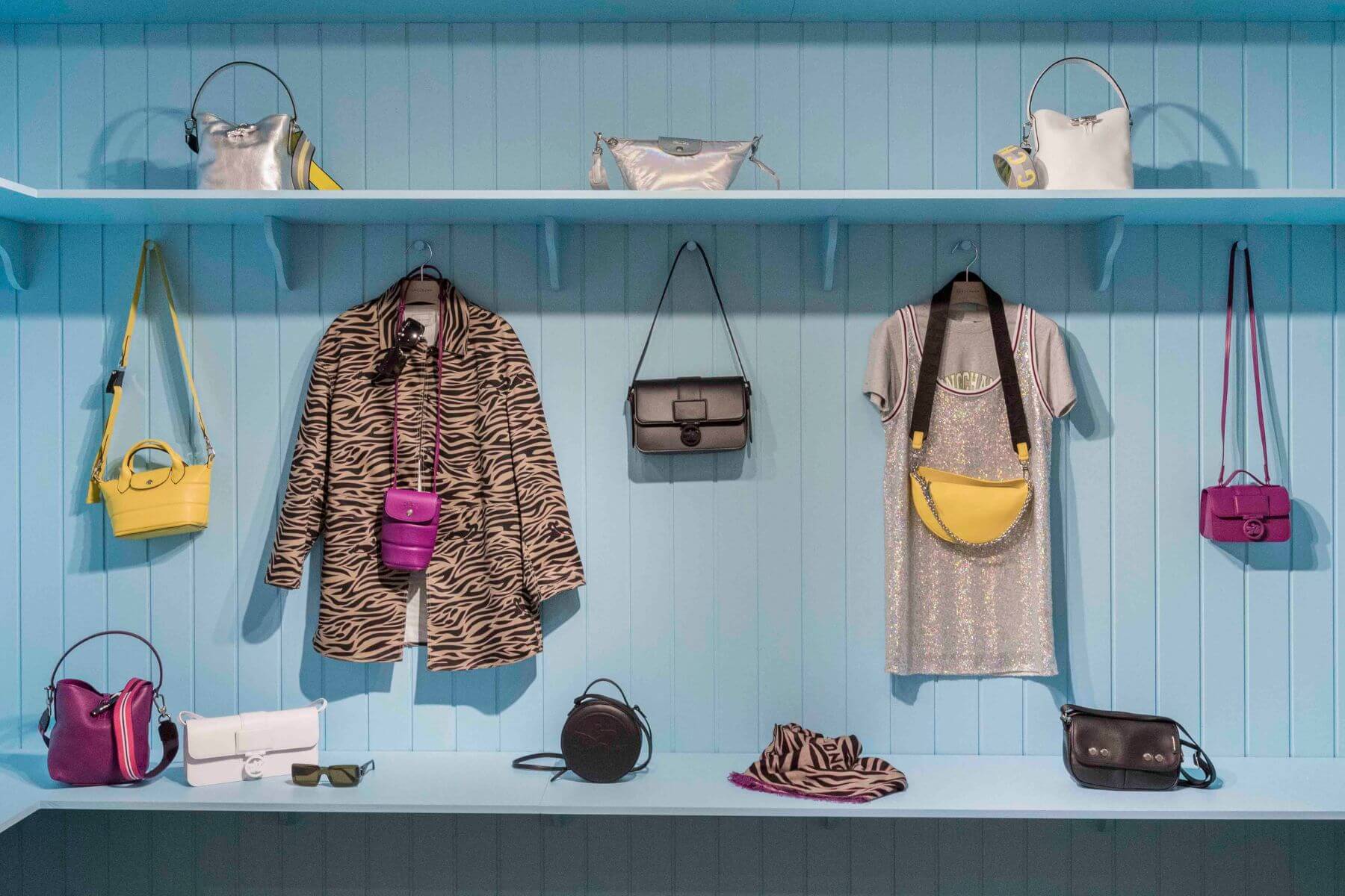 以搶眼斑馬紋、金屬閃亮元素和高飽和色彩單品所打造的派對衣櫃方案。