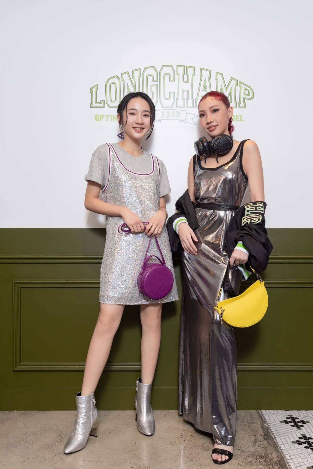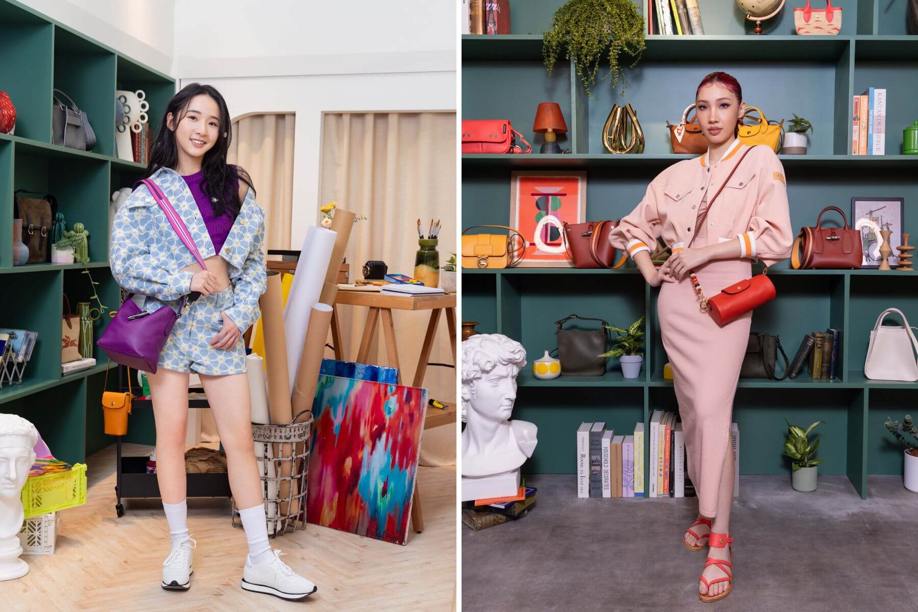 演員李沐(圖左)與創作歌手Karencici(圖右)示範Longchamp 2024春夏系列造型,展現時尚感校園風。