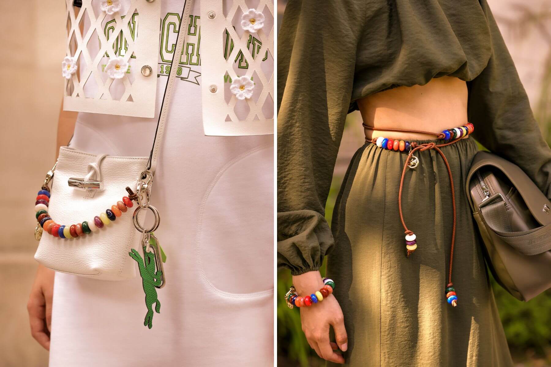 出現在服裝與包款上的彩色串珠可隨意拆卸,靈感來自旅行者球網世界各地名勝的紀念品。