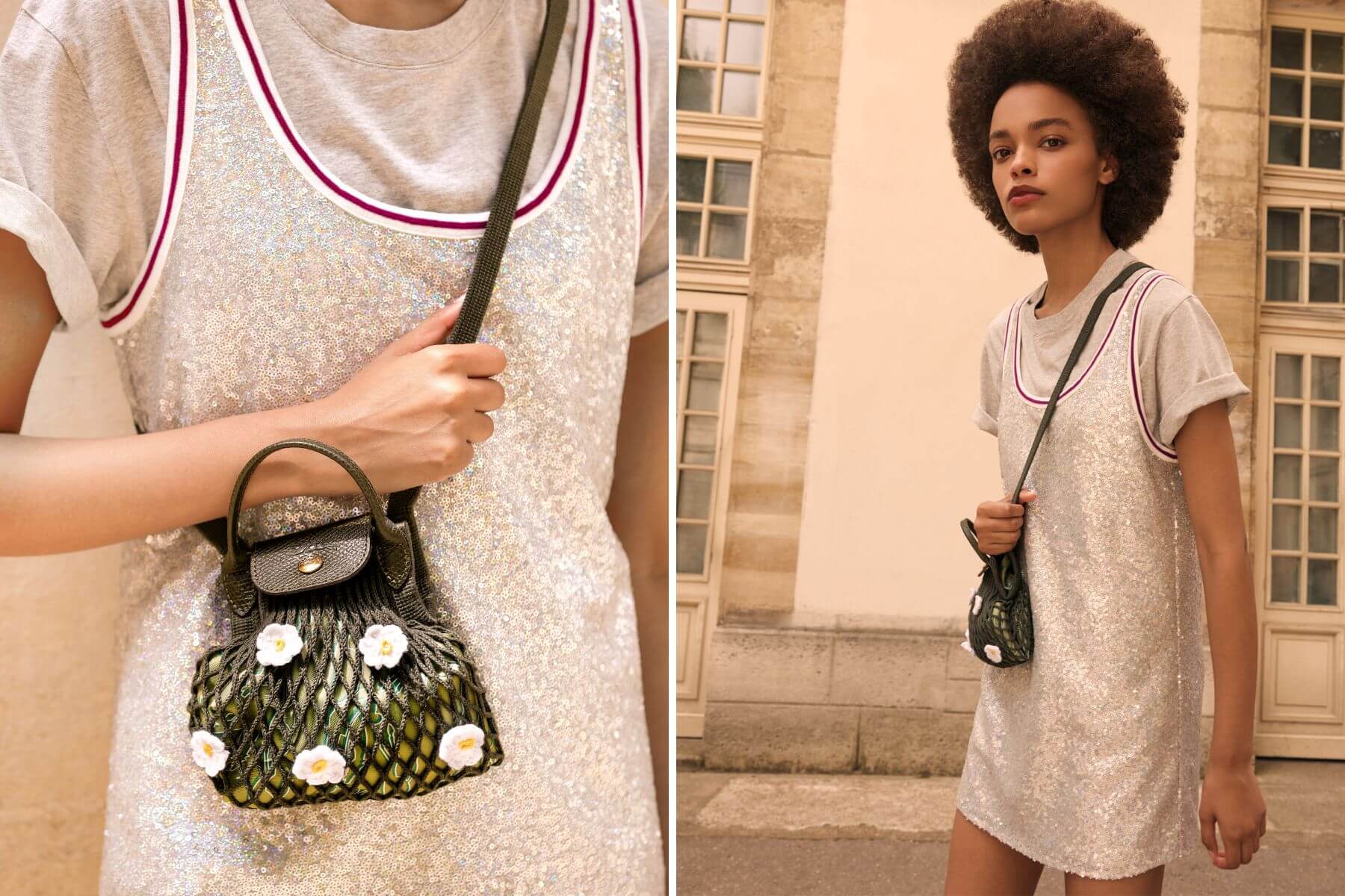 在日間造型裡,李沐以全套天空藍雛菊刺繡短板夾克與短褲造型示人,內搭印有品牌標誌奔馬圖案的紫羅蘭色針織無袖上衣,呼應手中的新款紫羅蘭色Roseau迷你水桶包;Karencici則身穿藕粉色連身洋裝搭配粉橘色夾克,搭配顏色搶眼的草莓色涼鞋和紅褐色Le Pliage手提包。