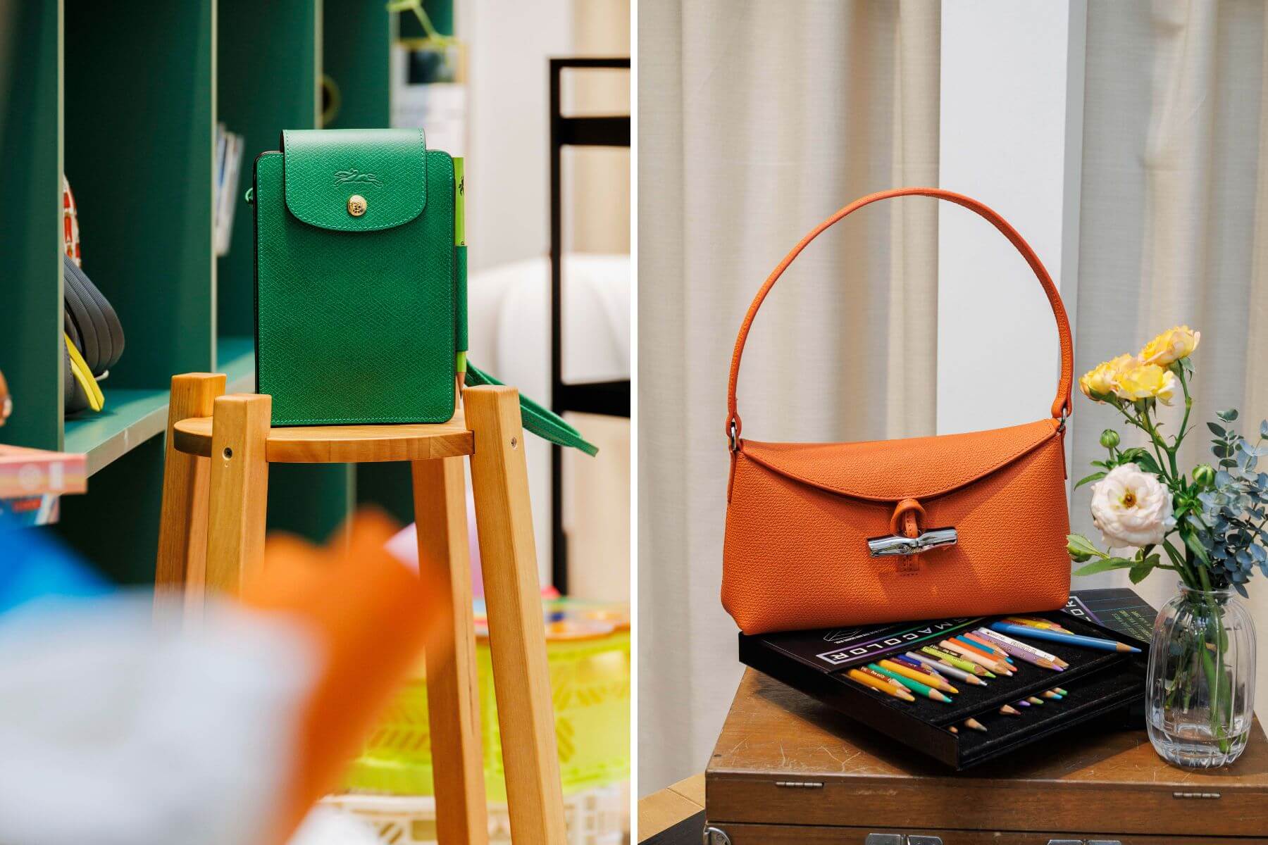 (左圖)Epure素描本綠色肩褙包(附鉛筆)_$11,100、(右圖)Roseau系列橘色肩背包_$13,600 by Longchamp。