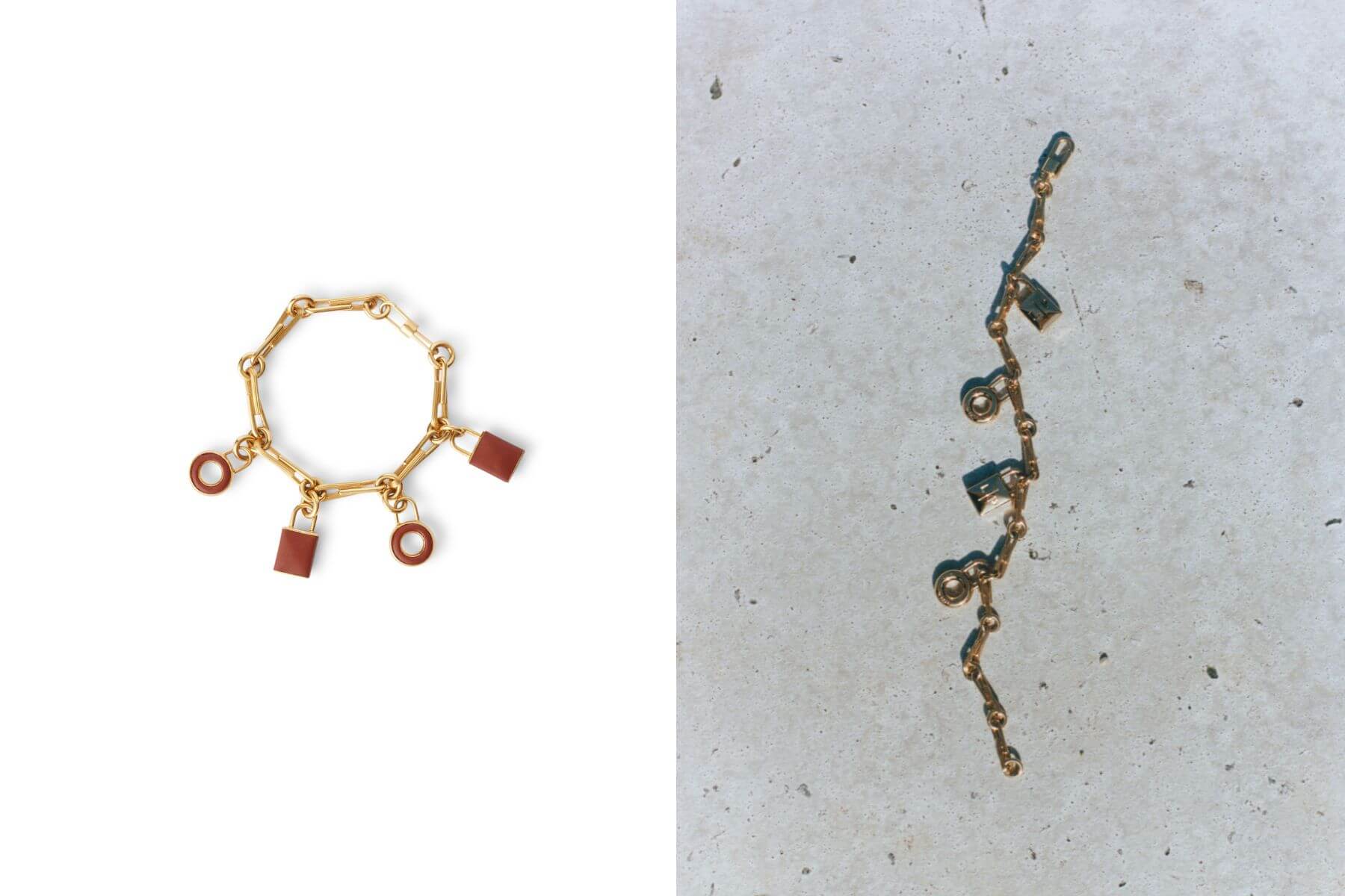 Charm Chain手鍊採用黃銅鏈條,飾有呼應新月象徵的「Ghiera」圓形配件與掛鎖吊飾,包裹柔軟皮革彰顯細節;同系列另有一條以Deep Kummel色小牛皮製成的Ghiera Toggle項鍊,配以黃銅栓扣,同時提供自由搭配Sun Gold色金鏈。