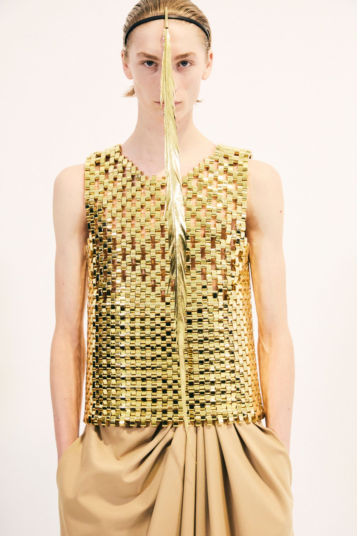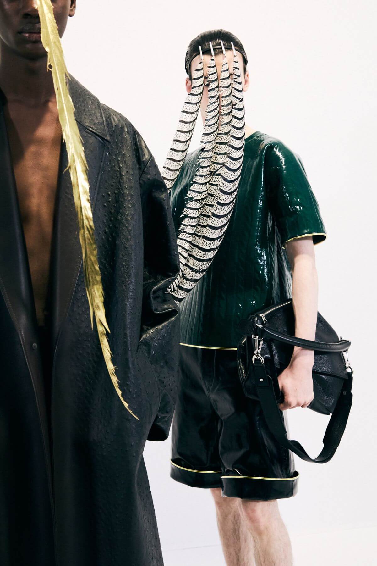 除了在同名品牌JW Anderson的出色表現,Jonathan Anderson更完美延續皮革工藝起家的西班牙精品Loewe所推崇的工藝文化。本季Loewe在巴黎共和國衛隊(La Garde Républicaine)馬術訓練場所舉辦的男裝大秀,便藉由現場擺放多位20世紀藝術名家之作品帶出本季主題,男模身上大量的羽毛、珍珠母貝與金屬等珍稀、異材質的運用與結合,也展現品牌的卓越工藝。