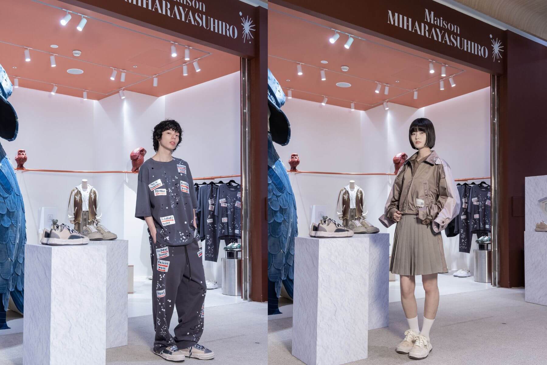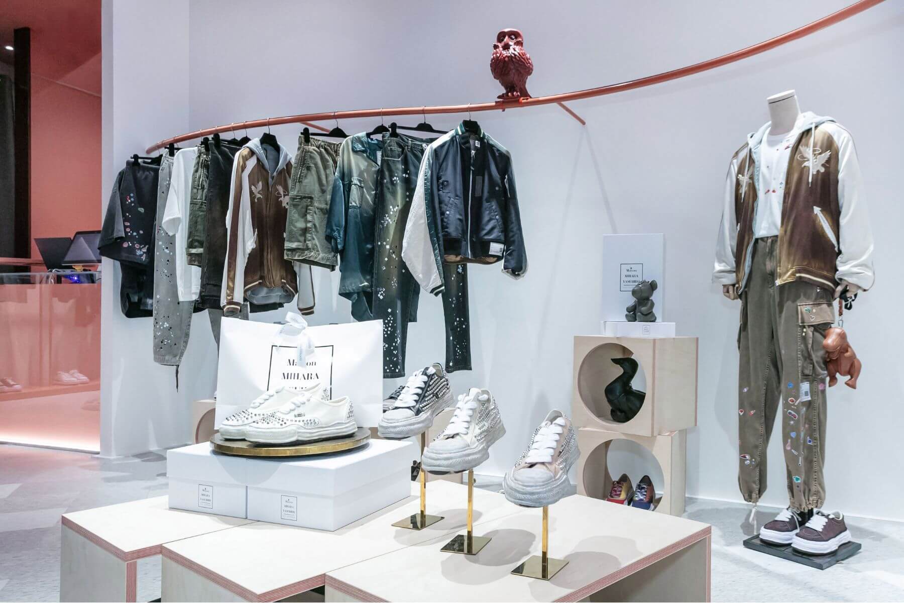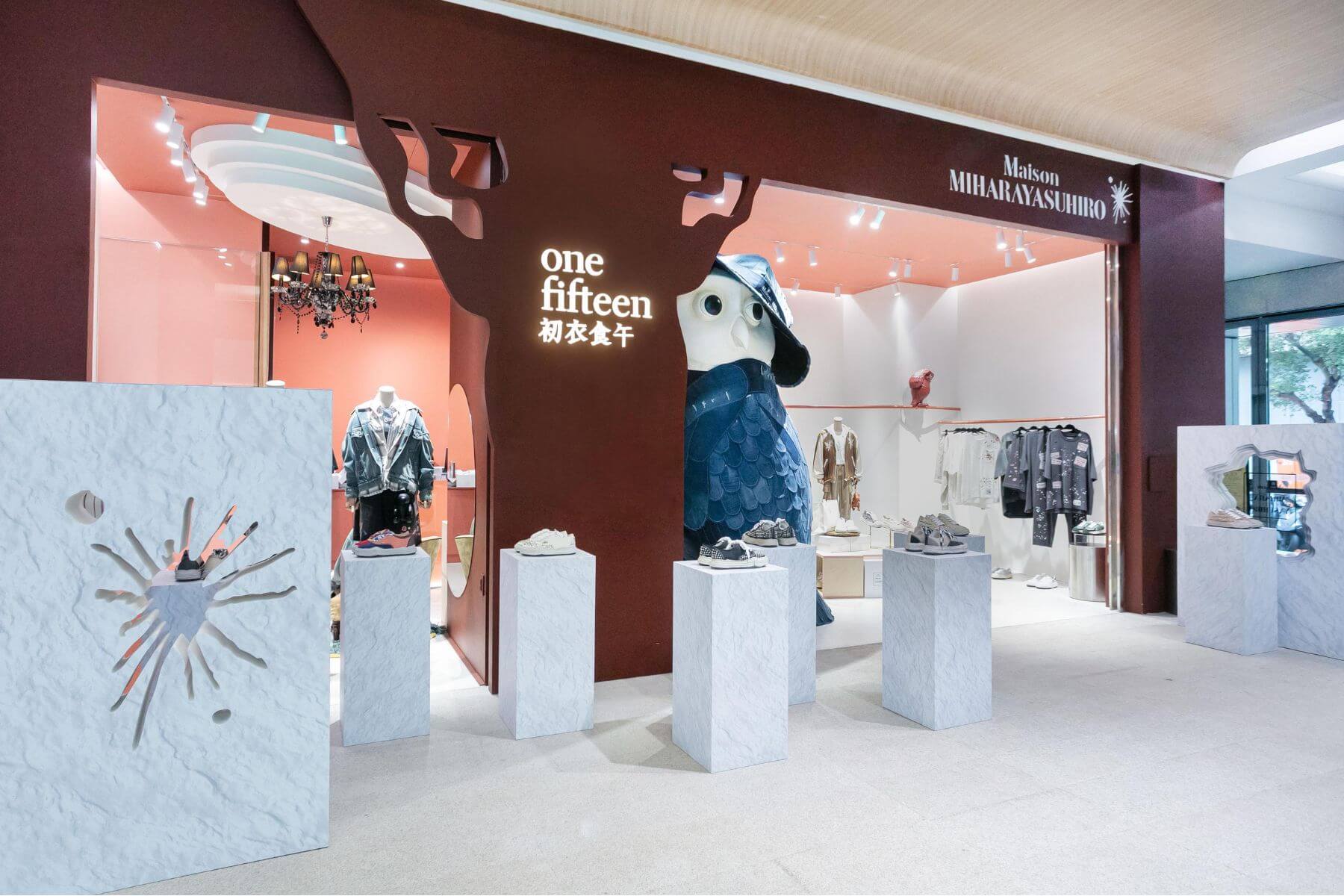 為了配得上三原康裕的設計精神,初衣食午連店舖陳設也做了大膽調整。現場不再是整齊劃一的櫃位,而是運用粗糙材質、破壞牆面與鏤空結構,營造出一種具備穿透感的展示氛圍。甚至連店內最具指標性的巨型貓頭鷹,也換上一襲全新丹寧拼接外衣向設計師致敬,讓選品店轉化為一場完整的內容策展。