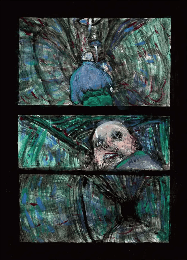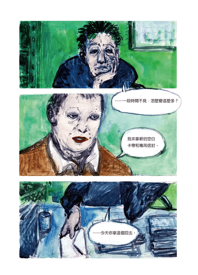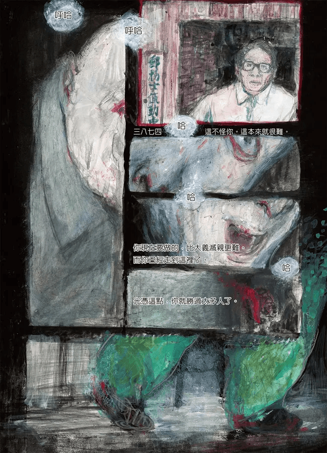 在《告密者》圖像小說中,曾耀慶展現了出色的視覺轉譯能力。他捨棄了傳統漫畫清晰乾淨的線條,轉而使用凝重、幽暗且看似紊亂的筆觸。這種視覺風格精準地捕捉了原著中那種「壓抑到令人窒息」的氛圍。