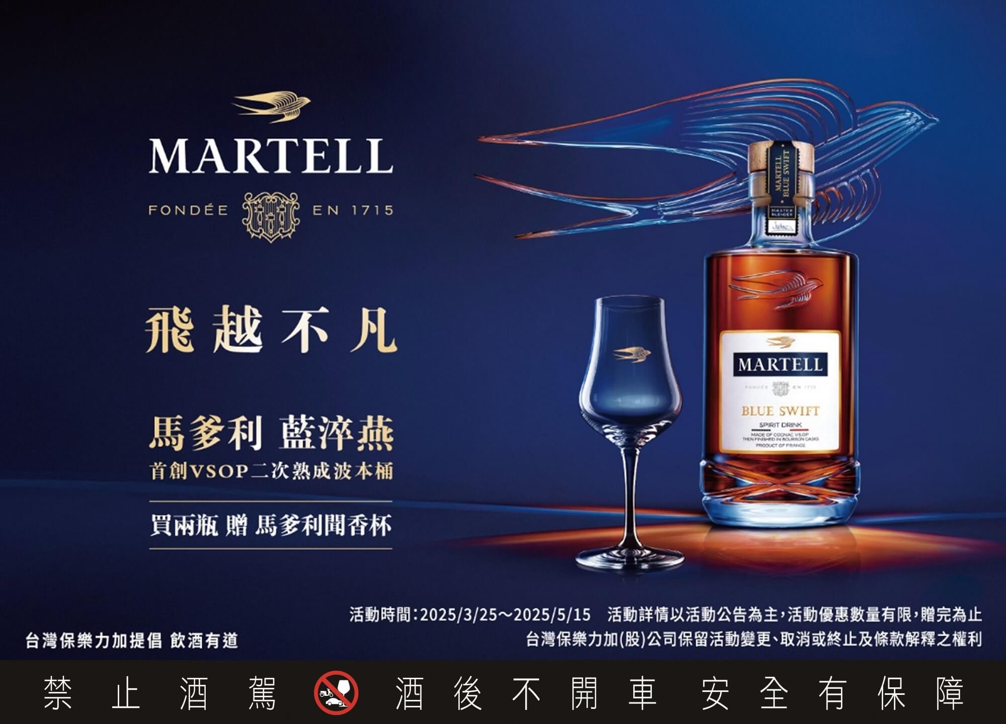 誠邀您一同走進馬爹利的舌尖畫廊,共賞以法國風土、歲月淬鍊與調和藝術繪就而成的干邑傑作!即日起至5/15,購買兩瓶「馬爹利藍淬燕」,即贈「限量馬爹利聞香杯」。以馬爹利的卓越干邑,勾勒日常品味時光,沉浸於法國優雅與輝煌交織的醉人氛圍,豐富生活中的每一刻。