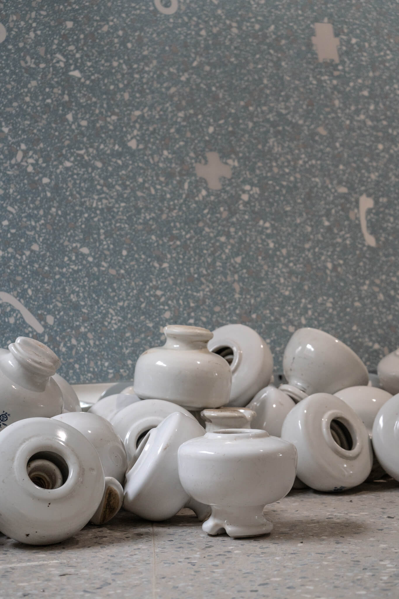 為了維護供電的穩定與安全,台電定期替換下來的退役礙子,變成每個材料倉庫堆積如山的待去化廢棄物。META Design將這些退役礙子切片、破碎,並將其製成深具台電語彙的特色建材「礙子石」,這些材料不僅有機會重新回到台電未來的建築空間,同時也象徵著台電的環保與永續理念。