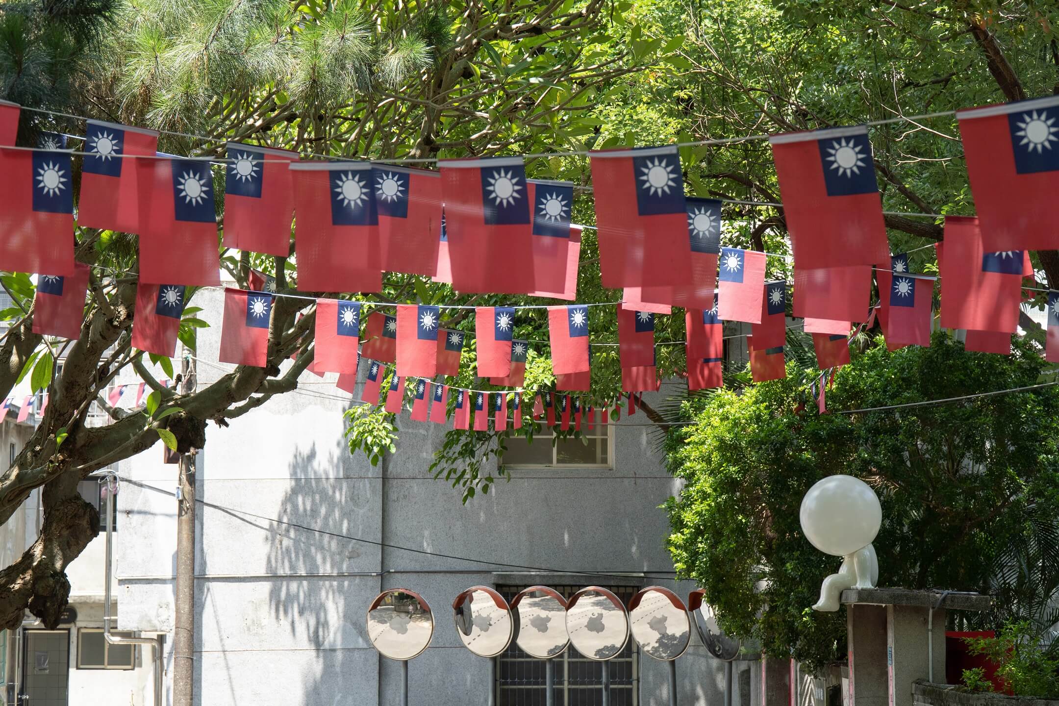 空軍三重一村內藝術裝置「燈泡人」與飄揚的國旗。