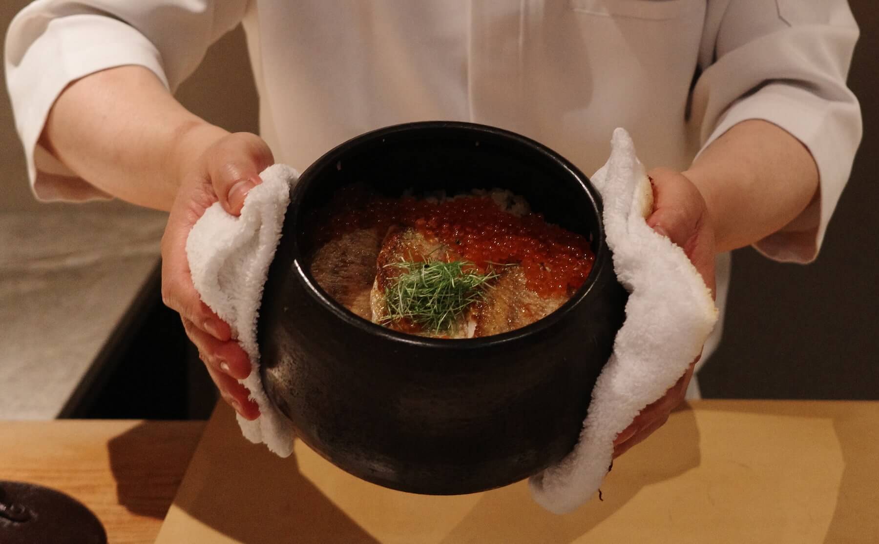 尾聲登場的是阿明師為本次餐會研發,前所未見的「紅喉釜飯」,選用鮮嫩、富有油脂的日本紅喉搭配鮭魚卵及山芹菜,輔以嫩薑切細塊解膩,成為意猶未盡的菜單壓軸。